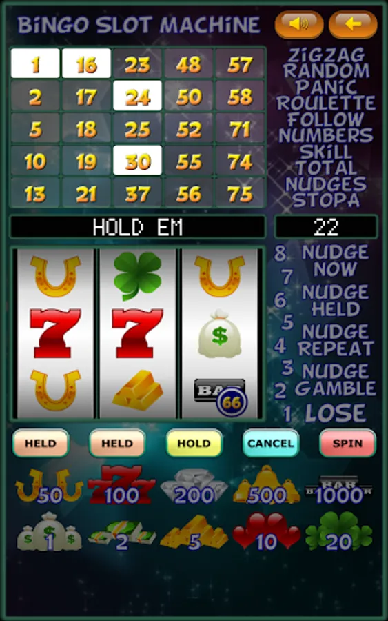 9/. Nudge: A series of wins are spun in, you have to stop the machine on one.
