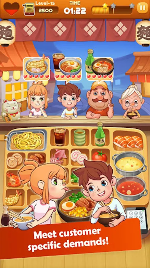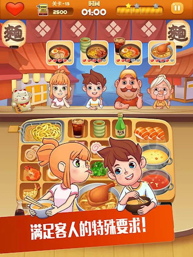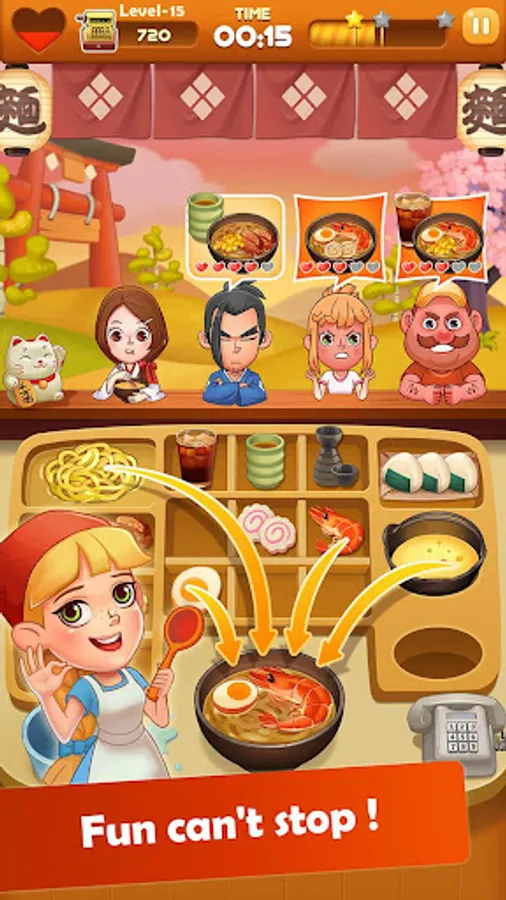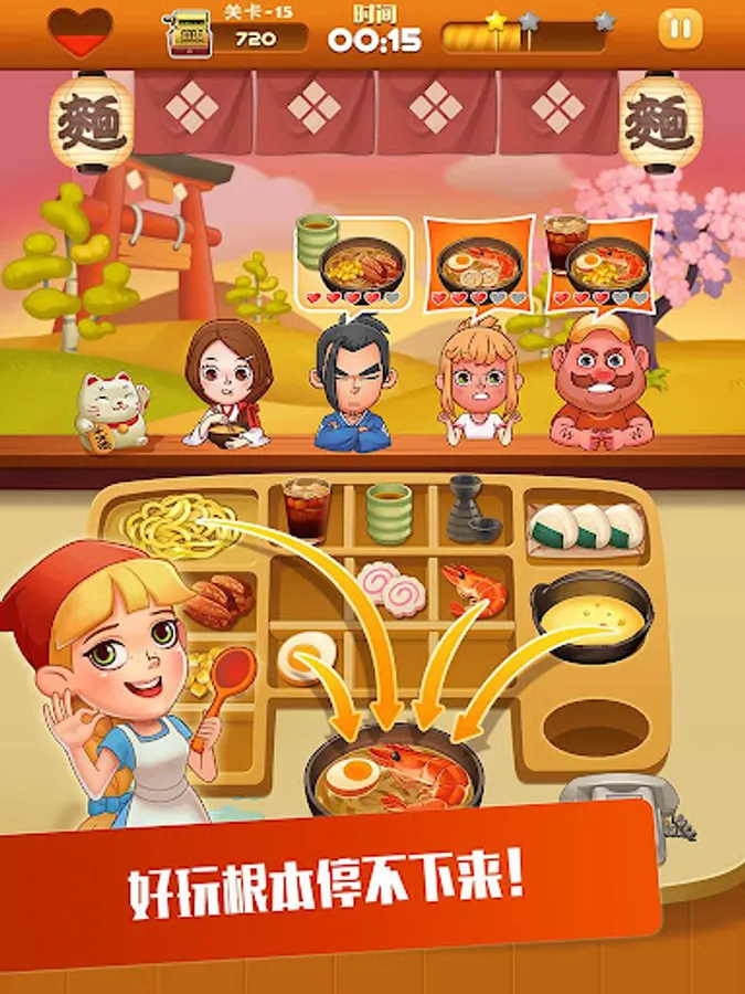 THE Ramen Master use healthy materials and delicious recipes to greet customers with a smile on her face. In the game, you can operating many Ramen restaurants, learning a variety of traditional and innovative noodle dishes, to meet the different needs of customers! Earn huge profits, buy more props to upgrade your kitchen, challenge more levels!