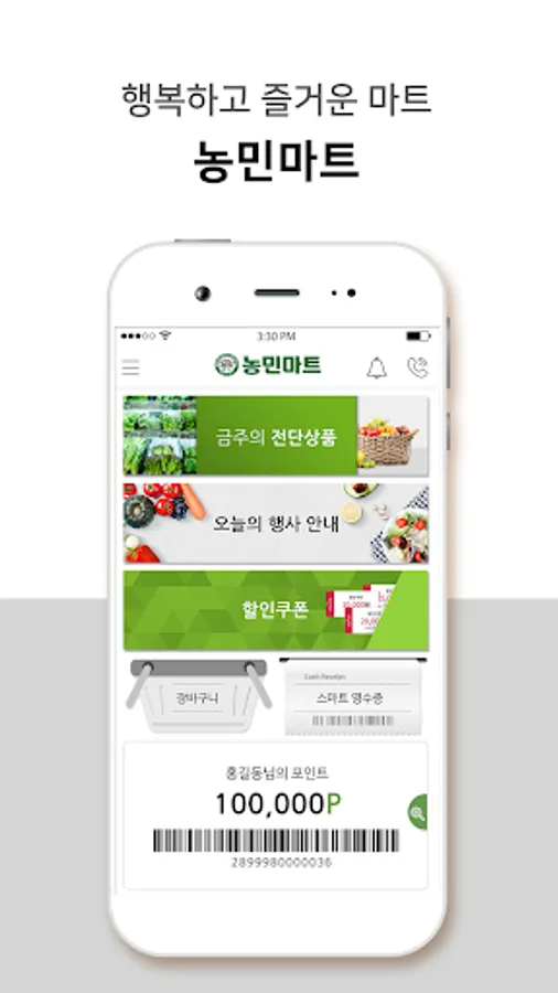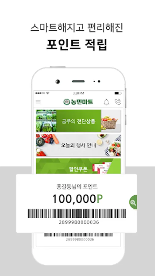 - 농민마트청계본점의 포인트 카드를 모바일로 편리하게 이용하시고, 언제 어디서든 포인트를 확인하실 수 있습니다.
