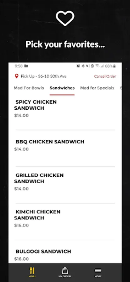 Ordering from Mad for Chicken has never been easier! Use GPS to find a location near you, review the menu, place your order, and it’s ready when you want it. And since you can pay in the app, there's nothing to do but skip the line, grab your food and go.