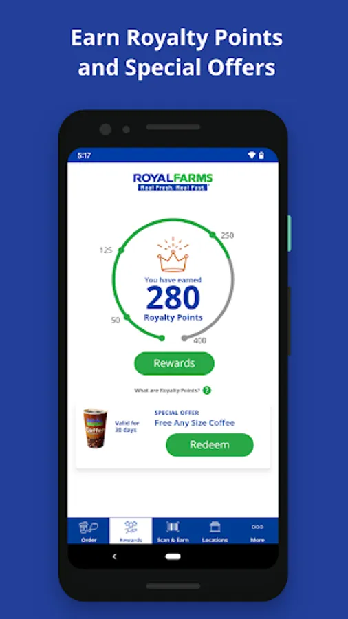 • Redeem your Royalty Points for your choice of 16 of our most popular food and drink options