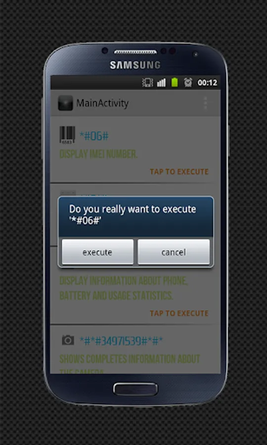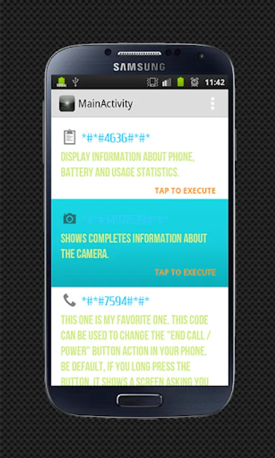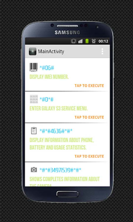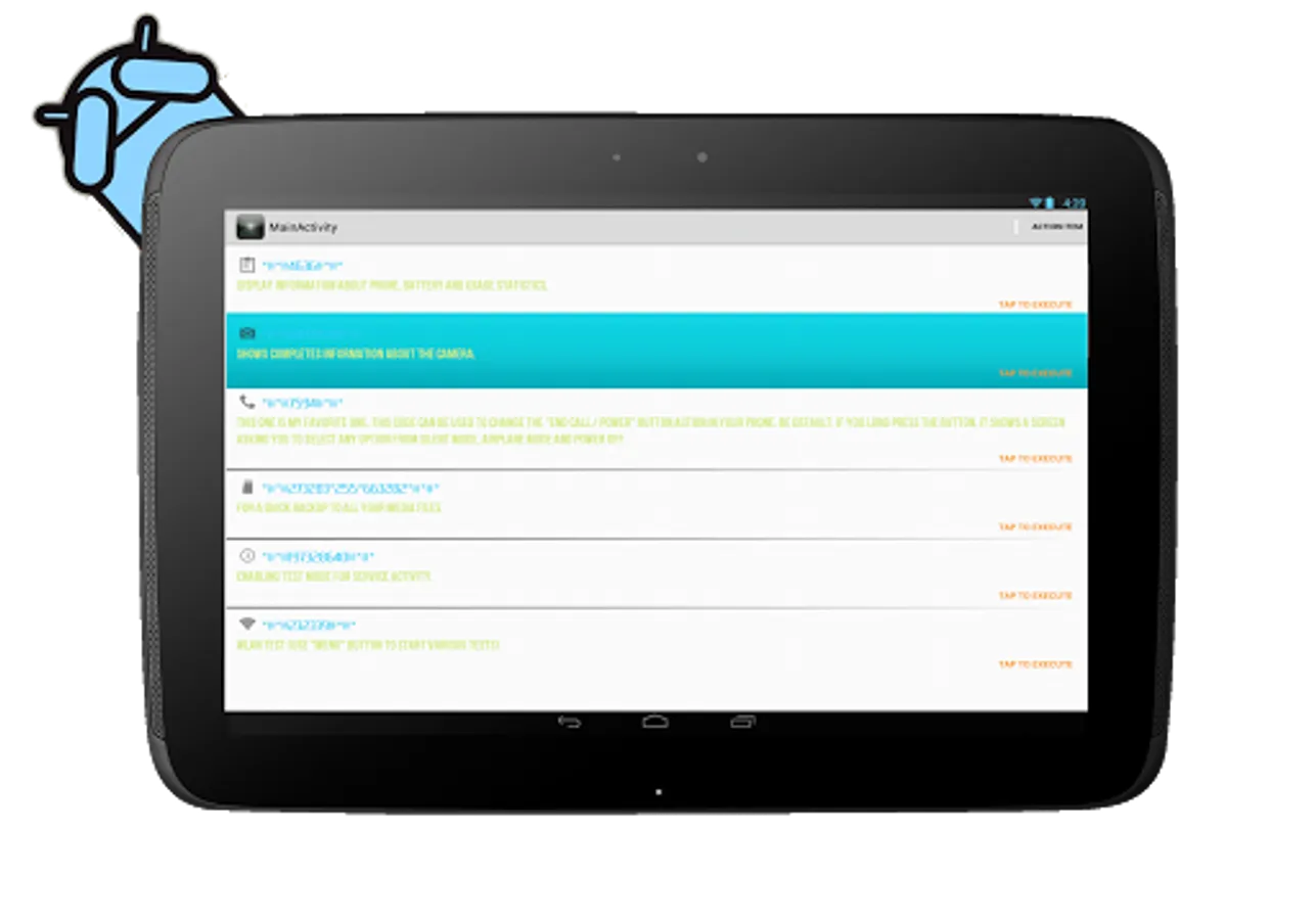 When those codes are typed manually from the phone dialer, they unlock a hidden menus with more options and information for your device. Now is not necessary to remember all those codes, they are just one finger tap away from you! Enjoy and have a fun!