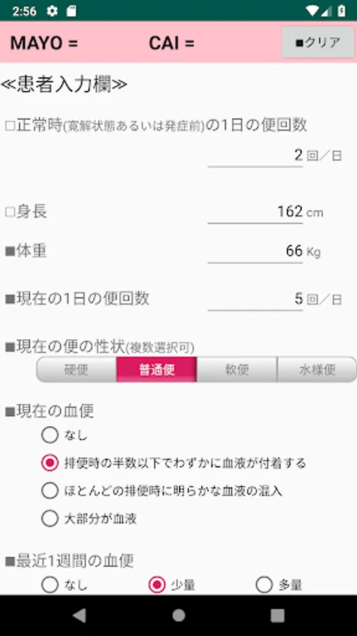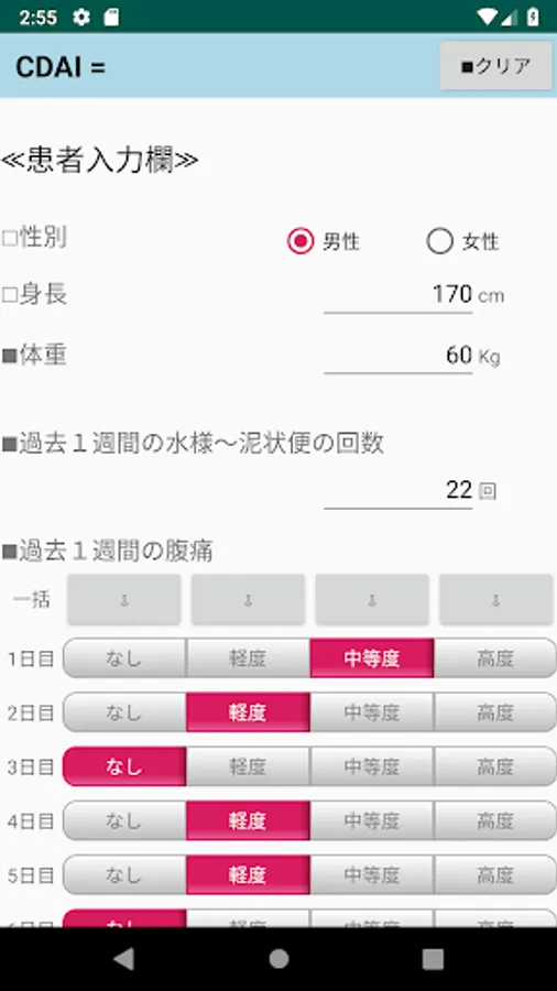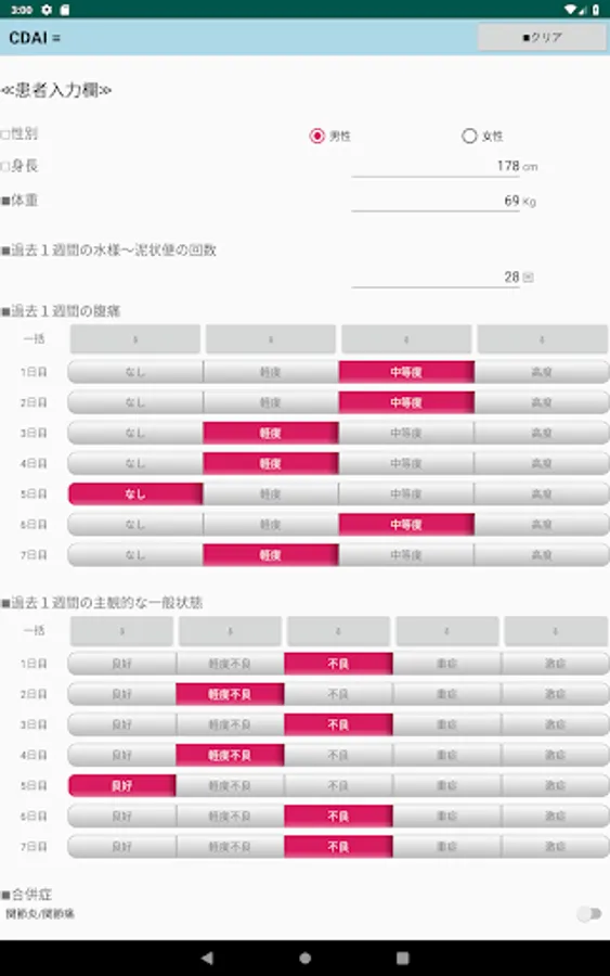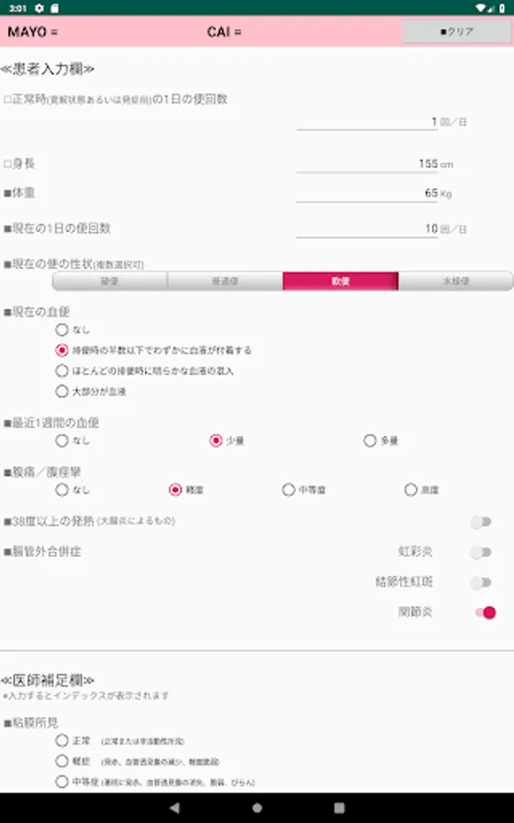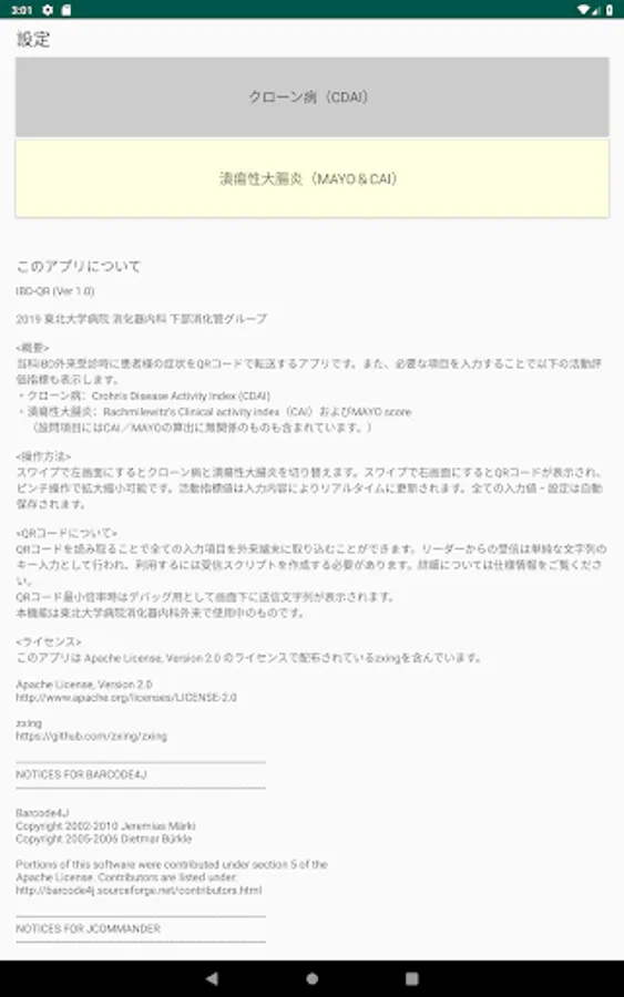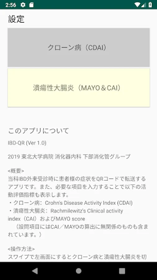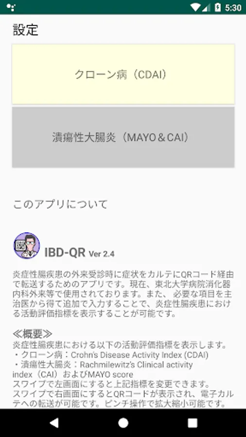 It is an application to transfer the symptoms to the medical chart via QR code at the outpatient consultation for inflammatory bowel disease. Currently, it is used in the department of gastroenterology at Tohoku University Hospital. In addition, it is possible to display the activity evaluation index in inflammatory bowel disease by obtaining necessary items from the attending physician and additionally inputting them.