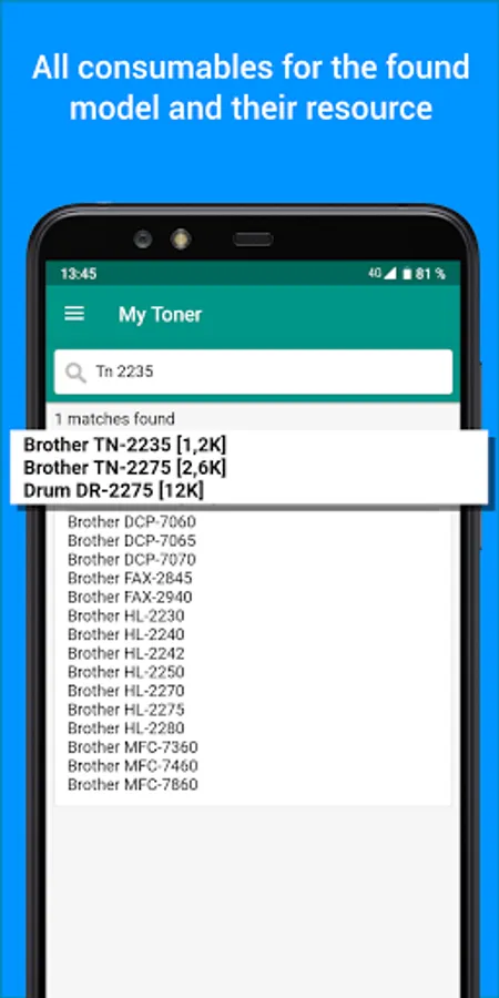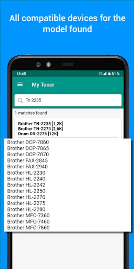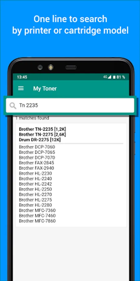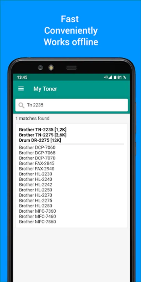 An easy and fast way to determine the compatibility of laser cartridges and printers. Just one line to search. Just specify the model of the printer or cartridge and instantly get the result: the name of the cartridge, its full model and resource, as well as a drum unit, if it is supplied separately. And of course the list of printers this cartridge is suitable for. No imposed sales and stores. The application works offline.