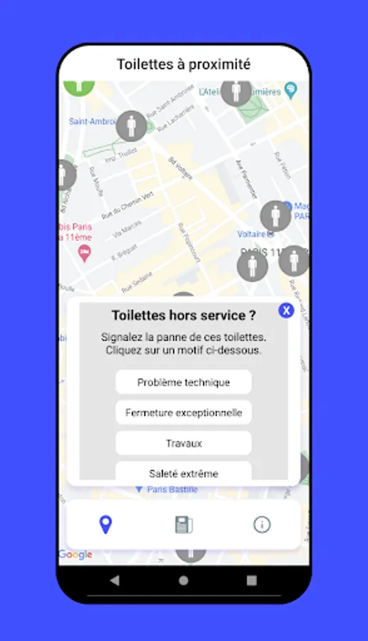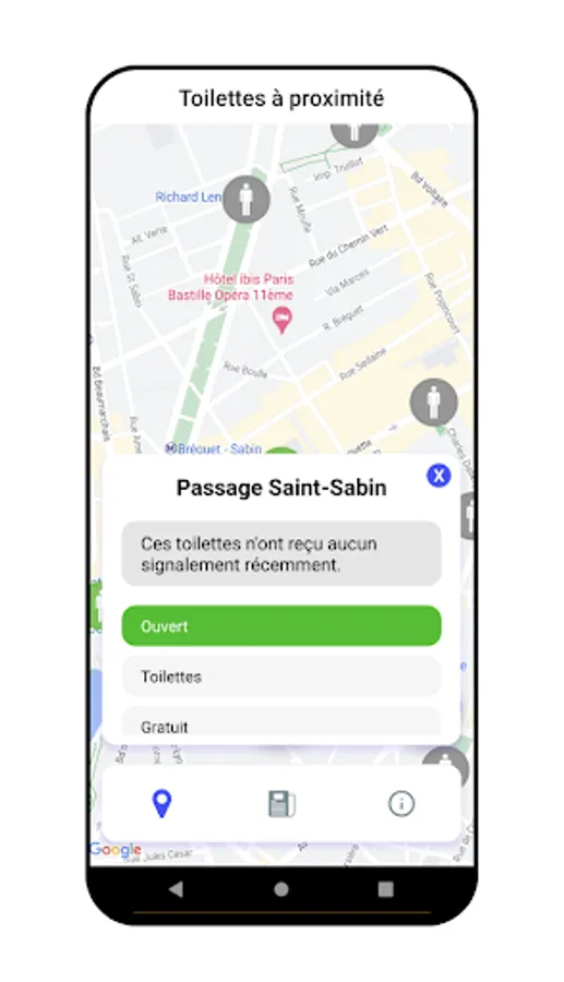 This free application allows you to locate nearby public toilets at a glance thanks to geolocation. Aim for open toilets, accessible to people with reduced mobility, report toilets out of service in a few seconds... The application will make your life easier, on a daily basis or during your stays.