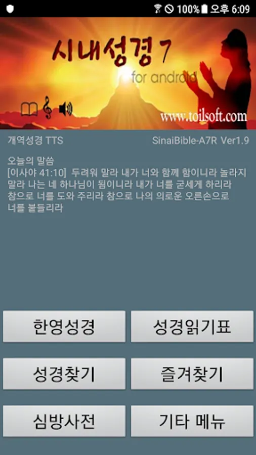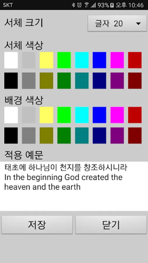 The Korean version of the Bible was published as the main text. The English Bible is the NIV version. Press the speaker button to play or pause the sound source. Chapter switching is possible with left and right arrow images and left and right touch scrolling. You can save your current location as a manual bookmark. Recently read Bibles are saved as automatic bookmarks on exit. You can copy selected verses from the text to the clipboard, add favorites, send text messages, send KakaoTalk, send mail, and register the Word of the Day. You can select the font size, color, and background color.