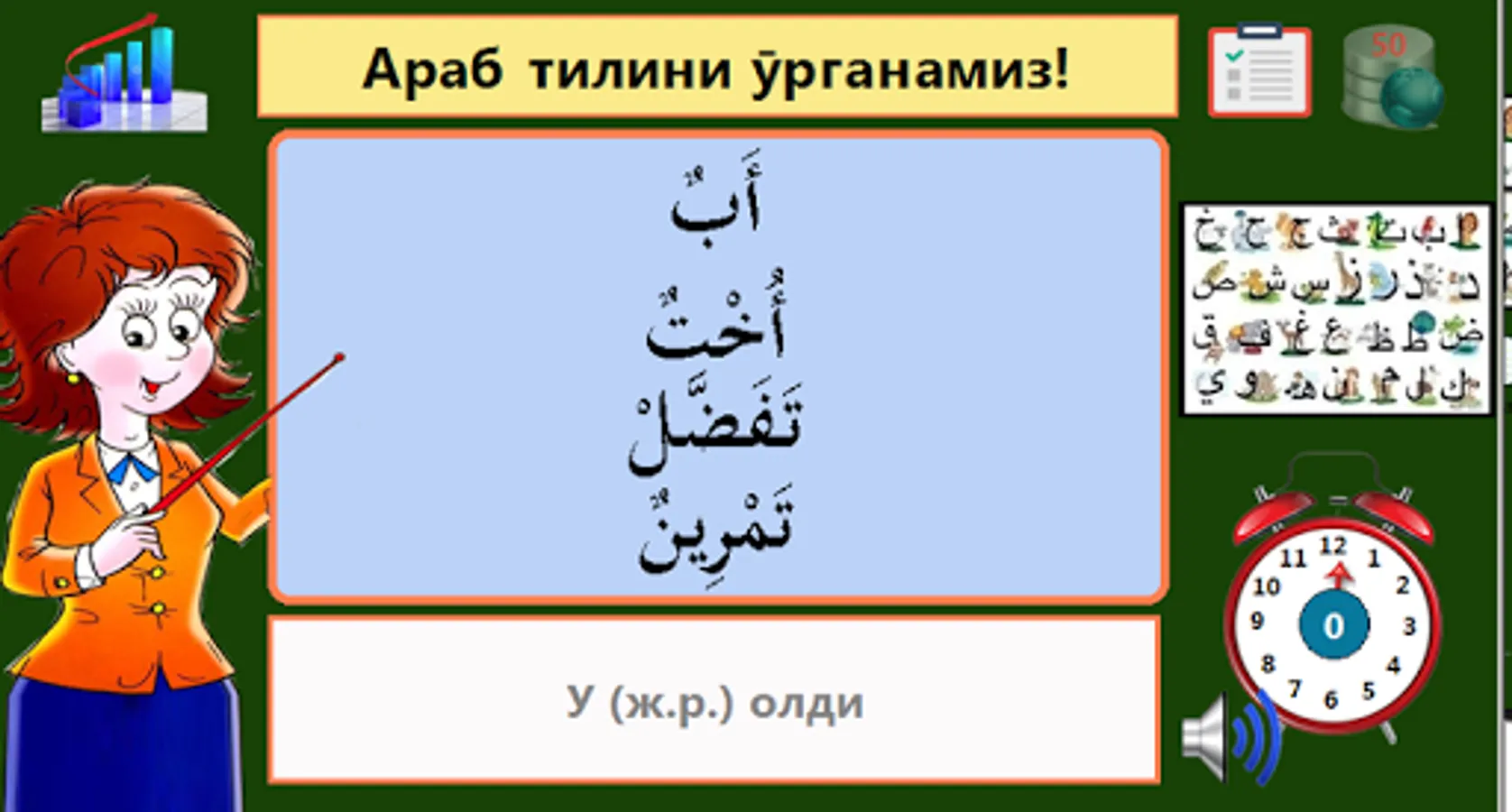 We study the Arabic language (in Uzbek). This application is designed to teach children and adults the Arabic language through test games. There are many levels and difficulties. By answering questions, you have the opportunity to open new difficult questions, and so on. Designed for users who speak Uzbek.