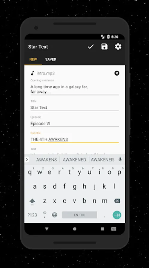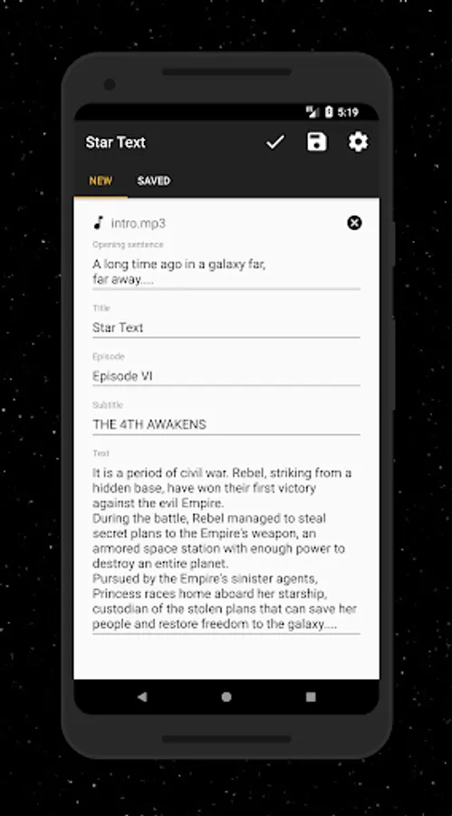 Just enter your own Opening sentence, Title, Episode Name, Subtitle and Text ,Then Crawl in style.