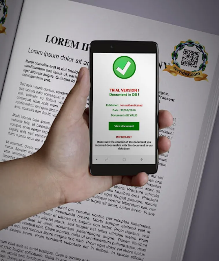 Certidox is the reliable, simple, and fast solution for certifying the authenticity of documents (i.e., press releases, proxies, purchase orders, contracts), diplomas and products. Certidox doesn’t require the use of a website to check their authenticity. You can also remotely deactivate/activate the Certidox QR code of a document, a diploma, or a product at any moment.