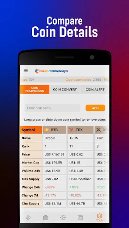 Tokenmarketcaps app offers a user-friendly crypto comparison feature. Investors can compare crypto prices based on market cap and volume. The comparison data are presented within a table and shows significant information such as the rank, price, market cap, and 24H volume within 24 hours.