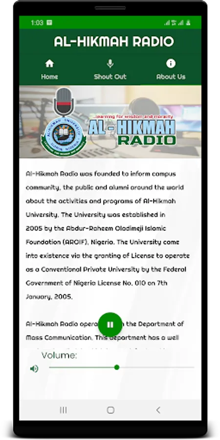Al-Hikmah Radio was founded to inform campus community, the public and alumni around the world about the activities and programs of Al-Hikmah University. The University was established in 2005 by the Abdur-Raheem Oladimeji Islamic Foundation (AROIF), Nigeria. The University came into existence via the granting of License to operate as a Conventional Private University by the Federal Government of Nigeria License No. 010 on 7th January, 2005.