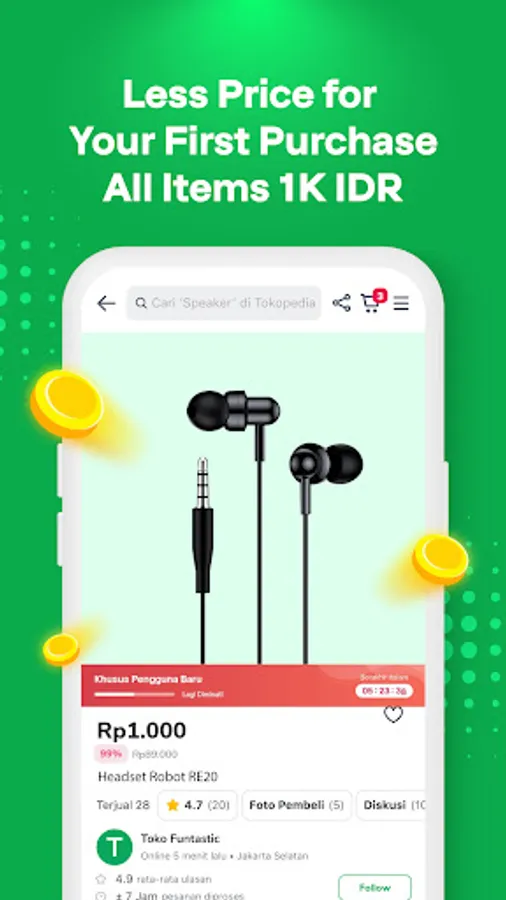 For you who have just downloaded Tokopedia, now is the right time to shop. Get all items only for 1K IDR! Come on, get your treat now!
