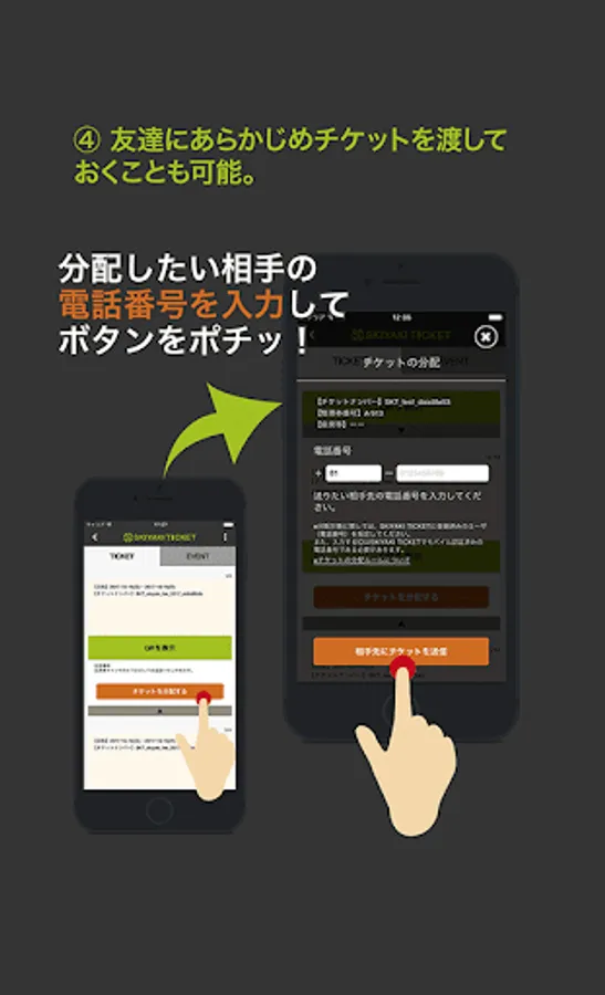 Click “Share Ticket” button in the ticket detail page and enter the phone number of your friend you want to share the ticket with.