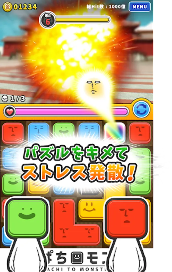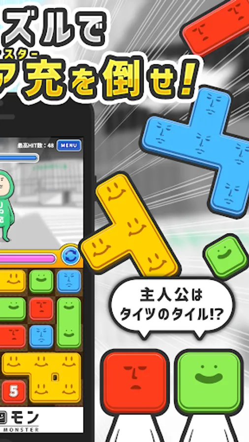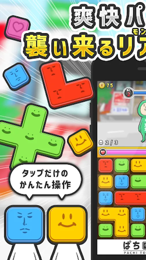 ・4色のブロックパズルで同じ色の隣接するものをタップすると、ブロックパズルが1つに統合され、