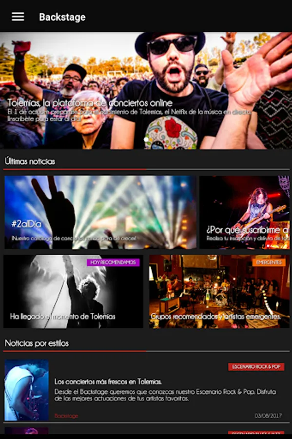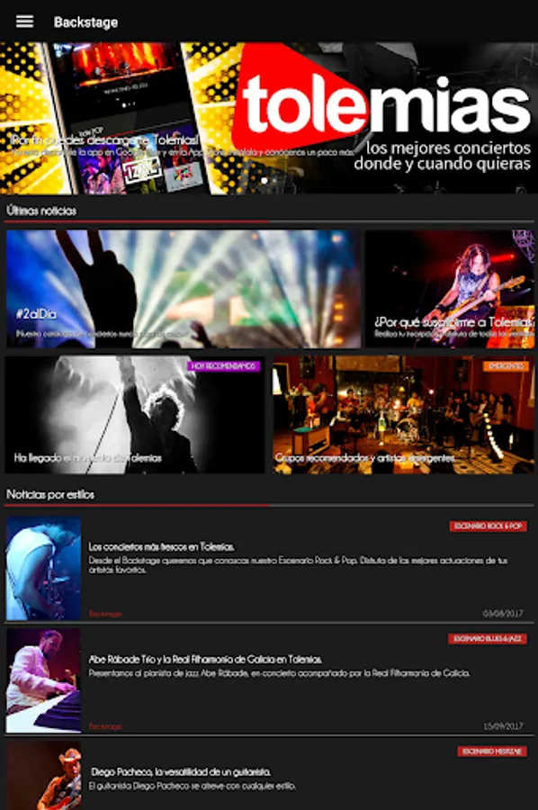 Welcome to Tolemias, the great digital Festival, the place where you can find several stages full of talent. Music of all genres; for all ages... But always with one fundamental thing in common: Tolemias only has live music… Authentic, sincere and pure. Real music.