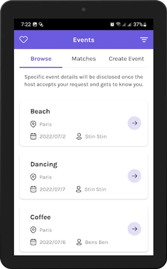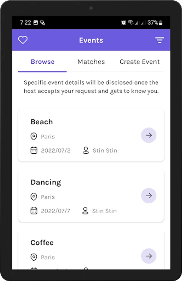 Create your perfect event or activity using Tolivi App. Set the time, place, number of guests, even who pays. Then sit back and let the matches roll in and decide who should join you. Or have a swipe and see what other social activities take your fancy. Who knows, you might just find a new favorite lunch spot, friends, or even a second date