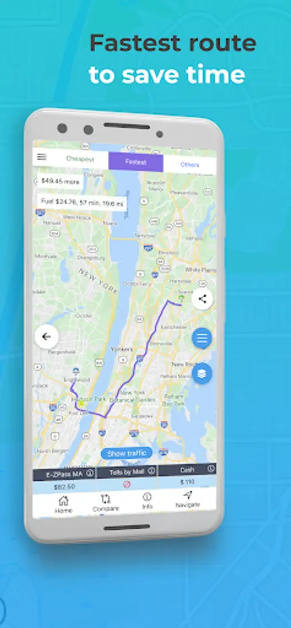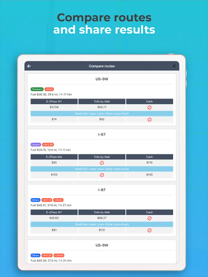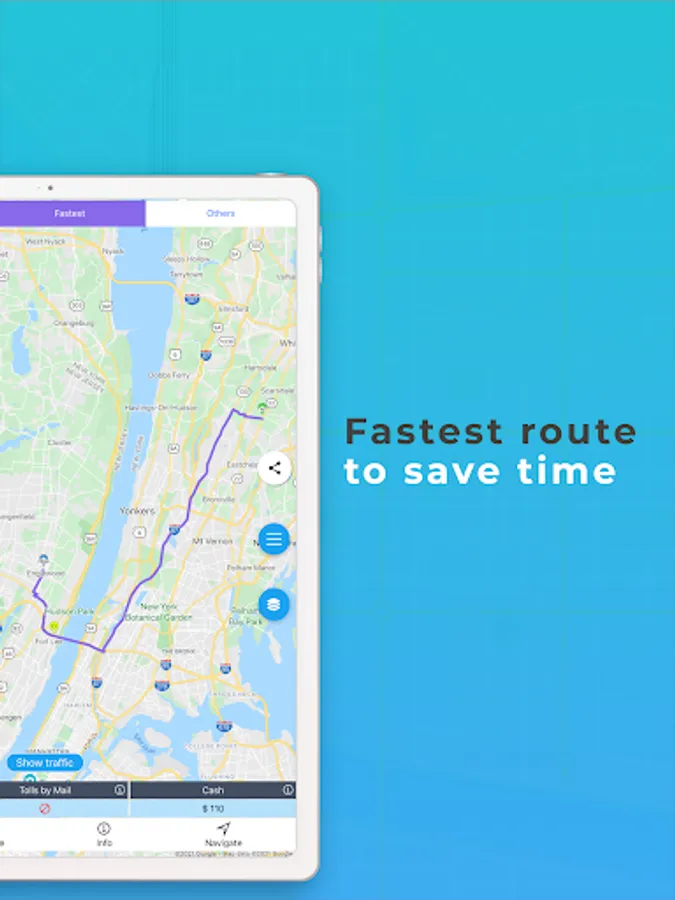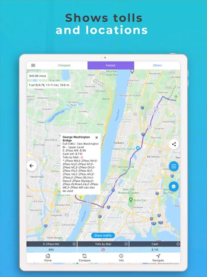 TollGuru, a marquee product of MapUp Inc - adds toll and fuel (gas, petrol, diesel, electricity) cost information - to Google, Apple and other maps. Travelers can compare trade-off between time and cost (toll and fuel cost) to pick an optimal route.