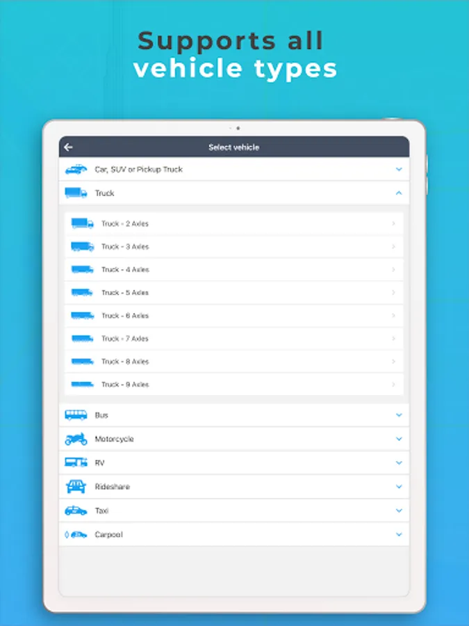 # Toll tax for car, carpool, rideshare, taxi, truck (up to 9 axles), RV, bus, motorcycle, HCM, EME