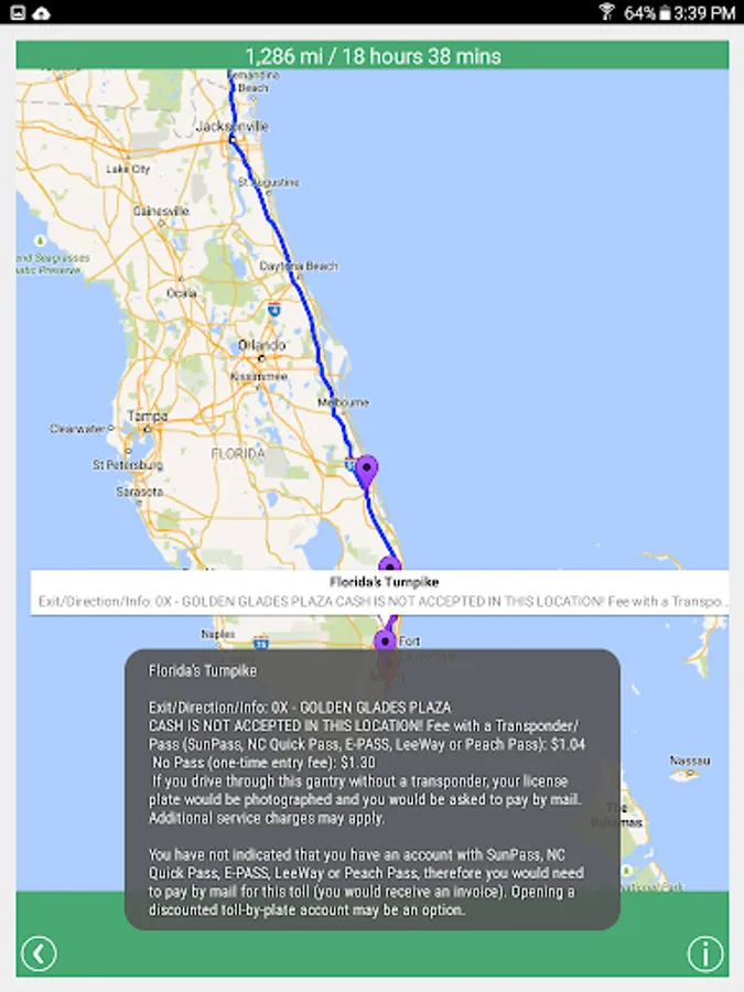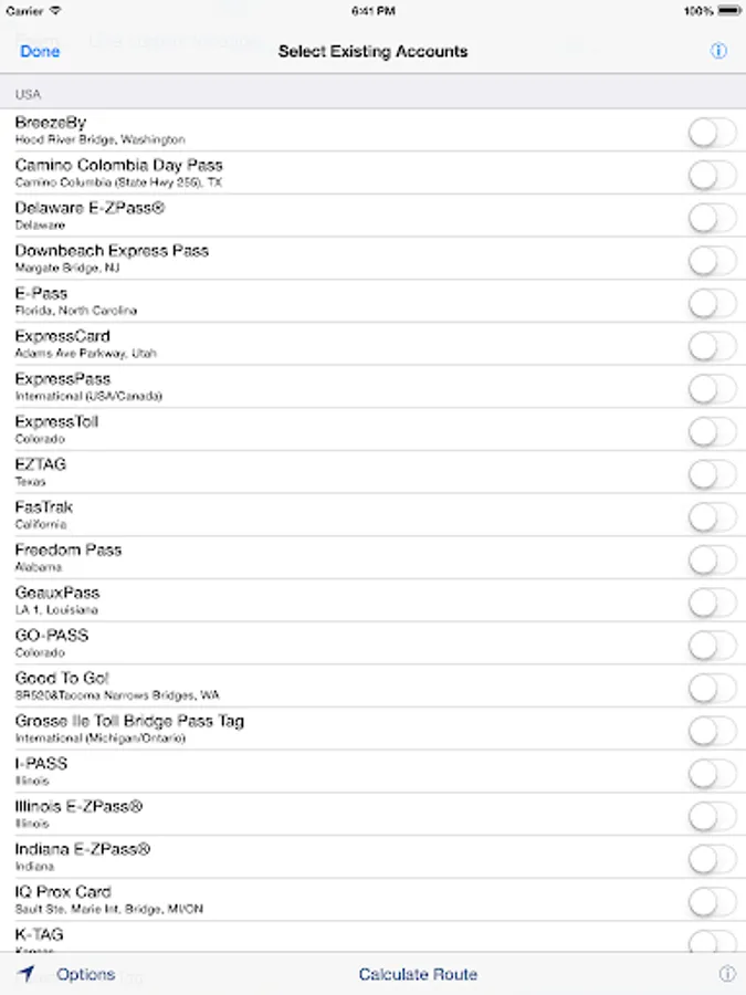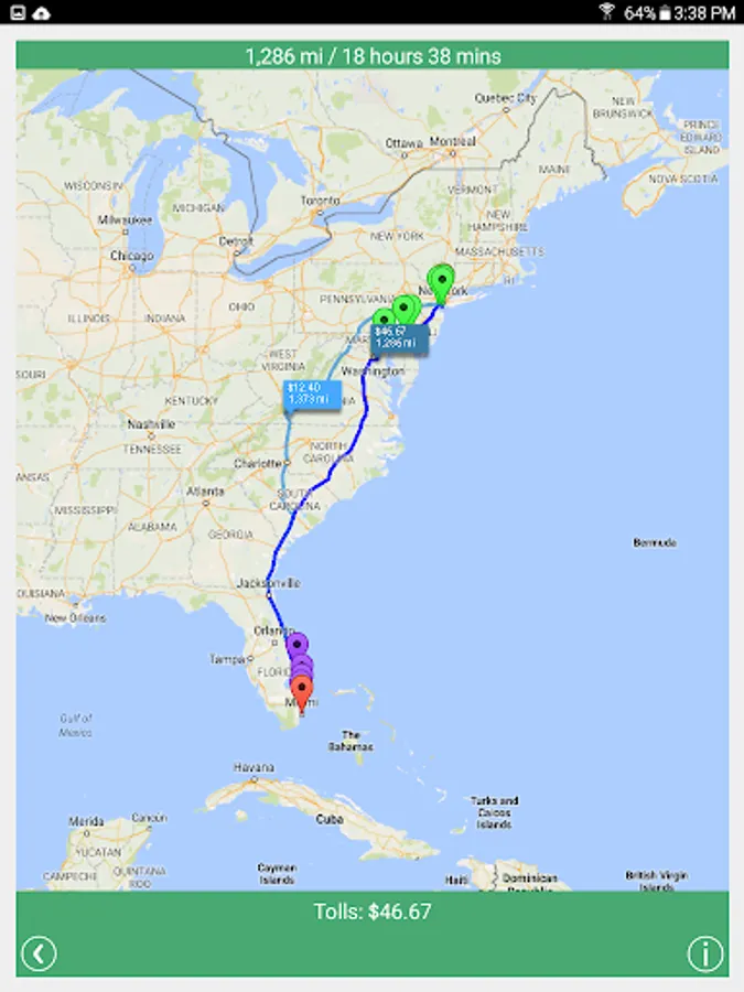 If you are traveling with a transponder you can select it from the comprehensive list of transponder accounts in the Options menu and Tollsmart will apply the appropriate discounts, as well as highlight which toll facilities along your route accept your transponder (green push pin) and which will not (purple push pin). Cashless toll booths are highlighted in red push pins. Please note for E-ZPass accounts it’s important to select the state in which your transponder account was acquired (i.e. NY E-ZPass) as discounts may not apply across other states, even those that are also part of the E-ZPass network.