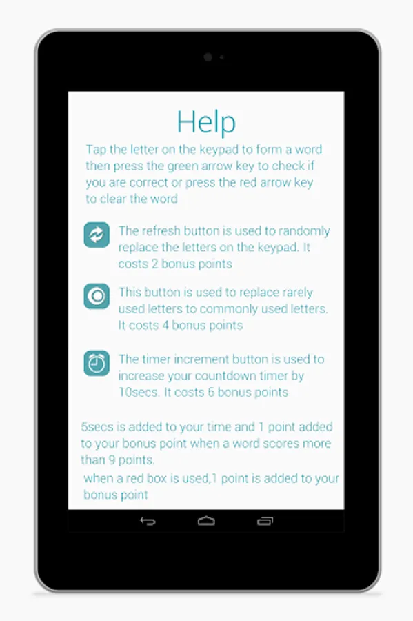 -The refresh button is used to randomly replace the letters on the keypad. It cost two bonus points.
