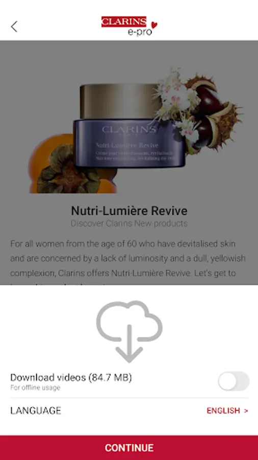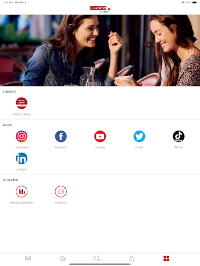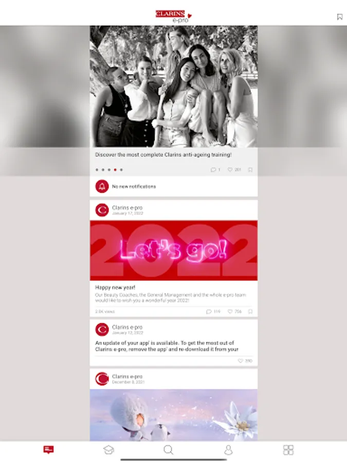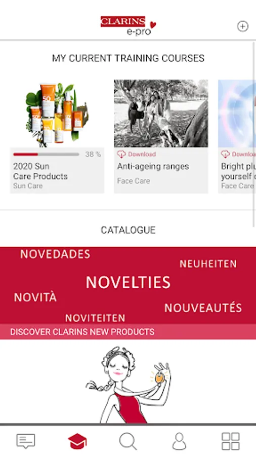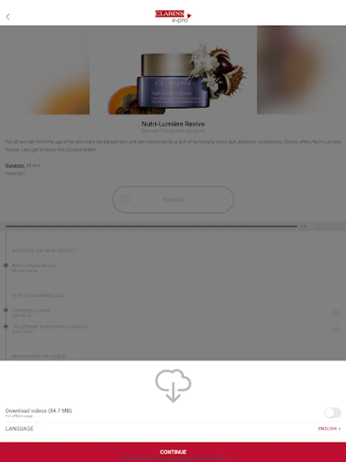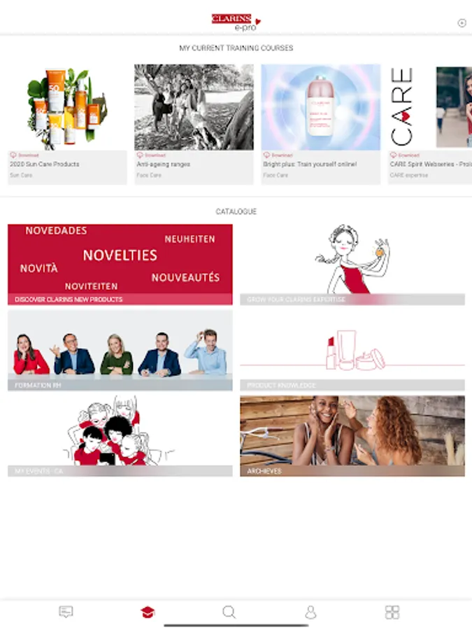 Clarins e-pro is the daily companion to answer the learning needs of Clarins beauty advisors. An educational, fun and all-in-one tool that will allow you to become an expert on Clarins brand and products.