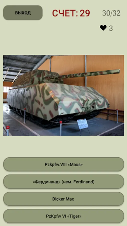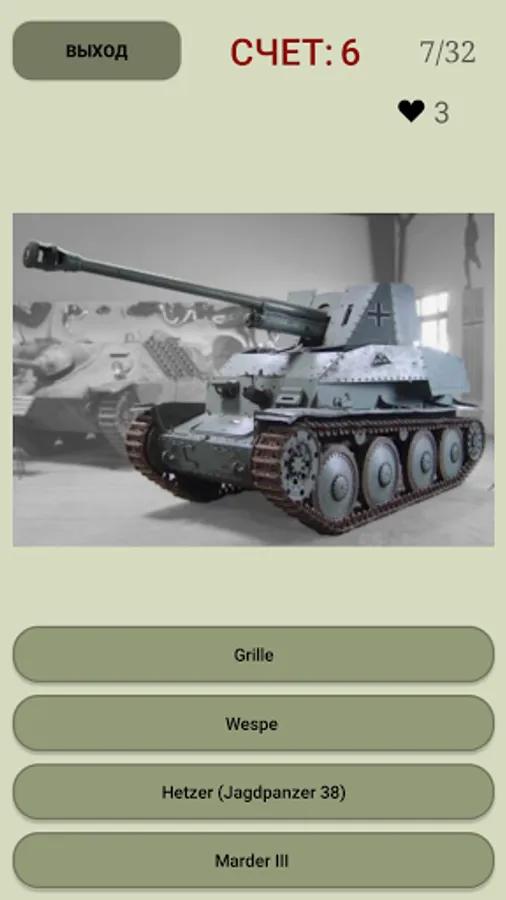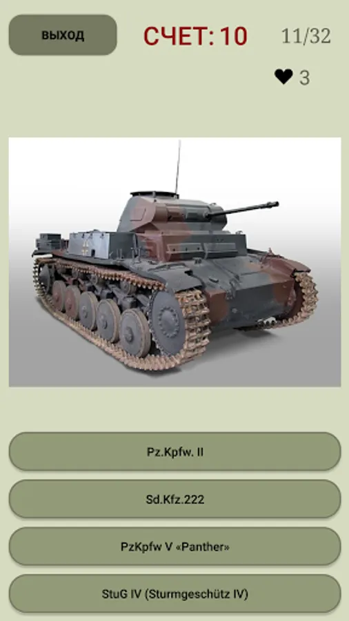 - 3 difficulty levels of the test for knowledge of tanks and armored vehicles