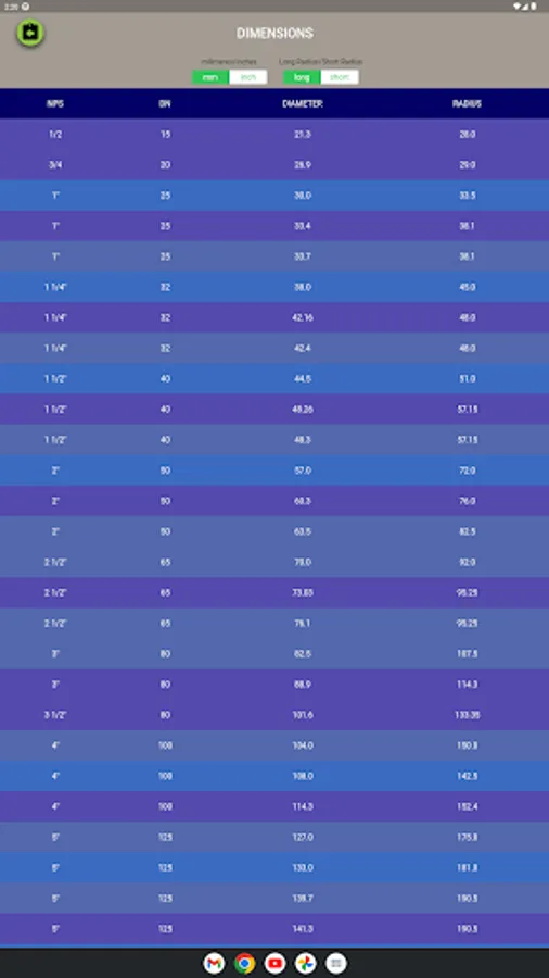 List: This feature provides a list of standard pipe dimensions, ranging from 1/2 inch to 40 inches, for both short and long radius elbows. Switch between inches and millimeters as needed.
