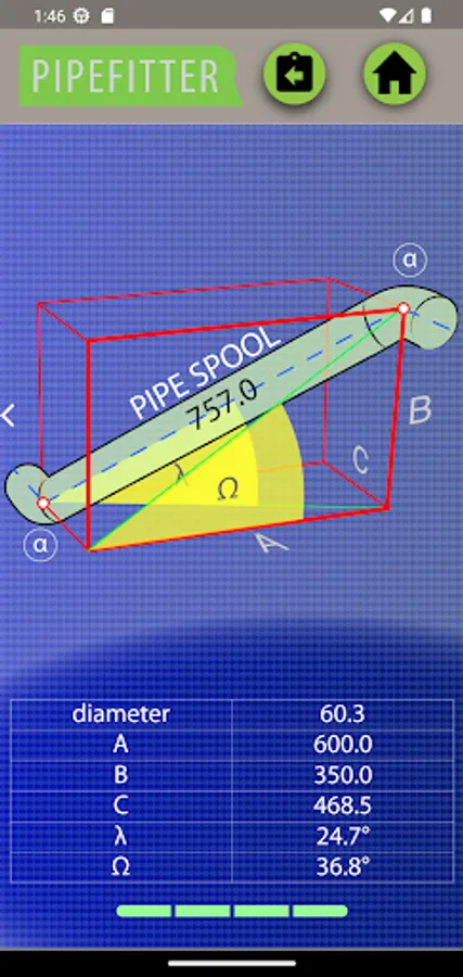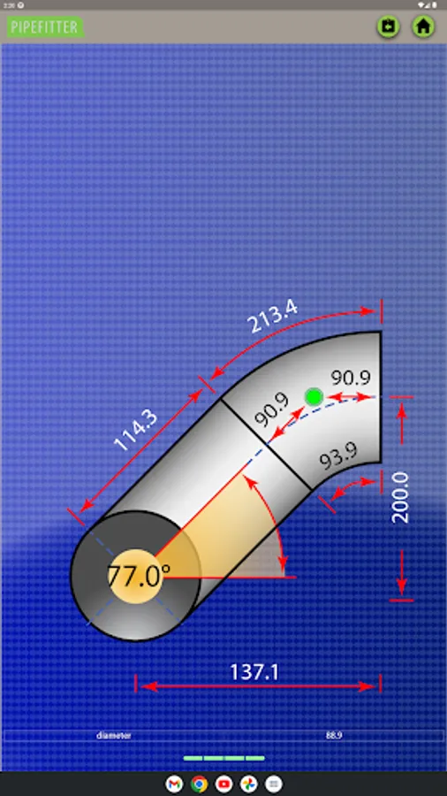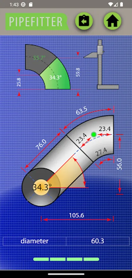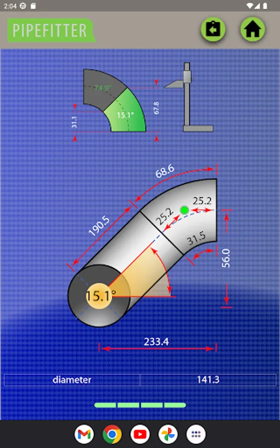 Tee-joint: Pipefitter also offers comprehensive tee-joint calculations, including the option to calculate the length and angle of the pipe connected at 90 degrees to another pipe.
