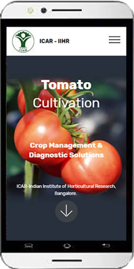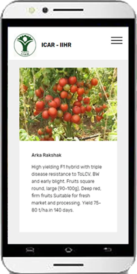The mobile app on “Tomato cultivation” is developed at Indian Institute of Horticultural Research, Bangalore, for the benefit of farmers and stakeholders involved in Tomato cultivation. The application includes crop production, Varieties, Disease management and pest management aspects. The crop production module includes soil & climate requirement, Land preparation, Use of bio agents, Nursery raising and seed rate, Transplanting, Drip irrigation, Fertilizers and Fertigation, Inter-cultivation, staking and weeding, Mulching and Foliar nutrition.