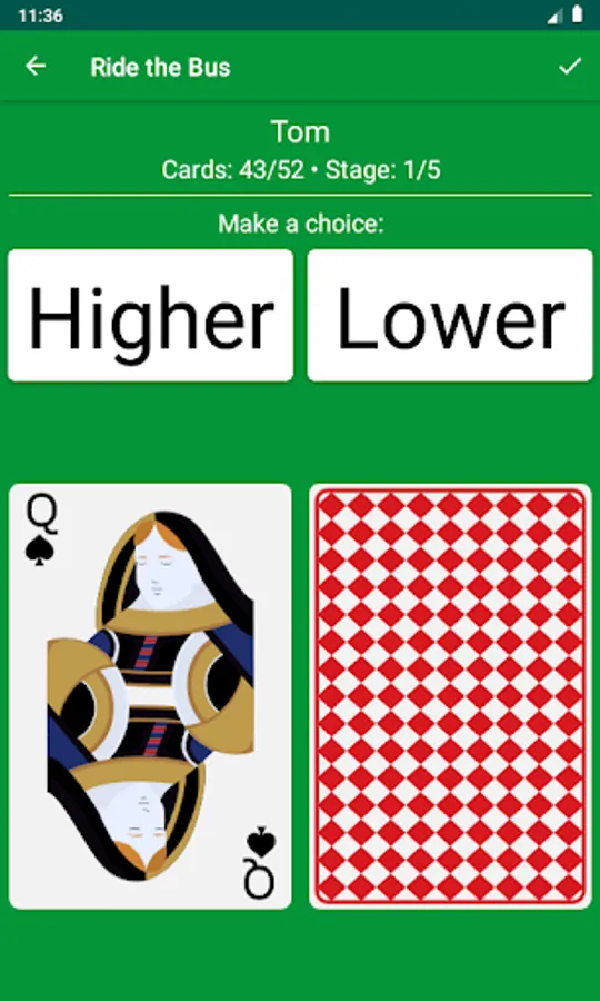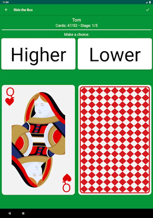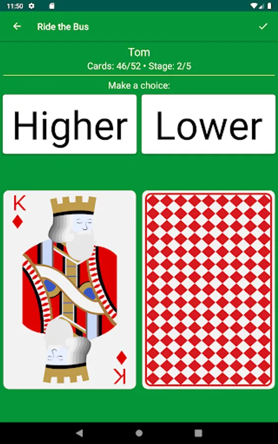 This game is being played by the loser of the last round. In this game, a new full deck of cards is being used (52 cards). The game exists of five stages, where each stage contains a single card from the deck of cards. The game starts at stage one. The player must guess whether the next card from the deck of cards is higher or lower than the card at the stage. For all stages holds, if the player guesses correctly, the player moves to the next stage, otherwise, the player will move back to the first stage. The card at the current stage will be replaced by the new card from the deck of cards.