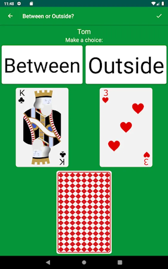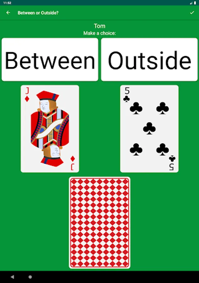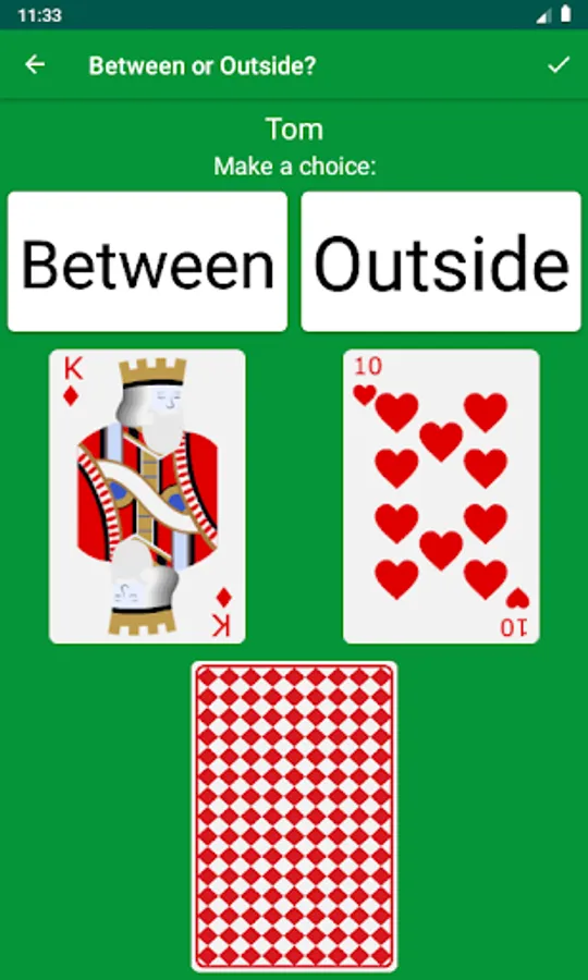 In this game, all players must guess whether the card lies between or outside the range of its first two cards. For example, if the first two cards of the player are six and ten, eight would be "Between", while five would be "Outside". If the player gives a wrong answer, the player must drink.