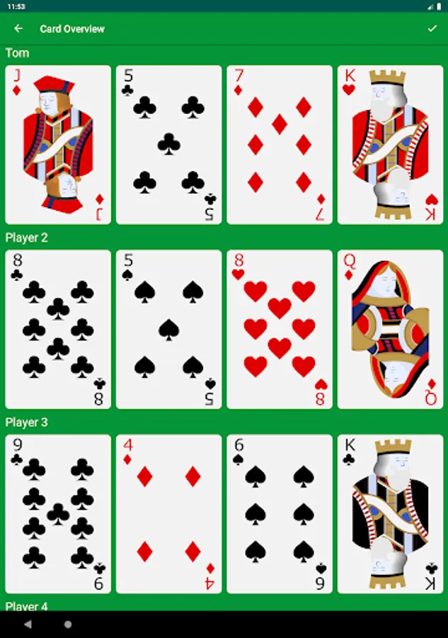 Riding the bus is a popular drinking/card game and is being played in multiple rounds. In the first four rounds, all players obtain a single playing card from the deck of cards after answering a question about this card. This means that after playing the first four rounds, each player contains a total of four cards. In the fifth round, a pyramid of cards is being build. In this round, players can lay down their cards on the pyramid. The player with the most cards left at the end of this round is playing the sixth and final round, named Ride the Bus. In the following, all rounds are being explained in more detail.