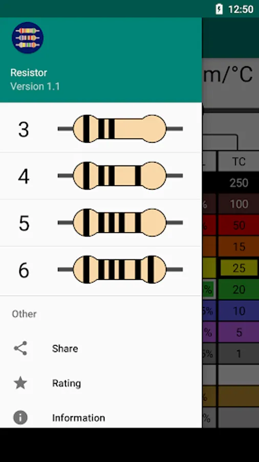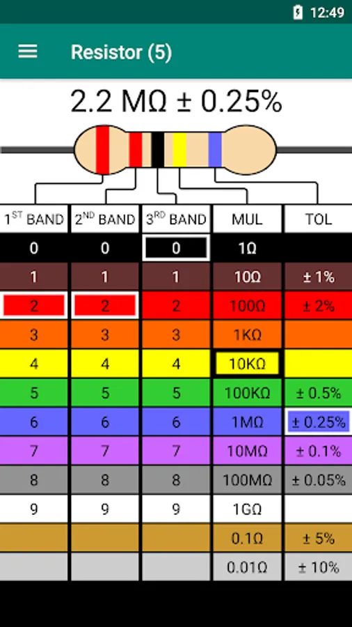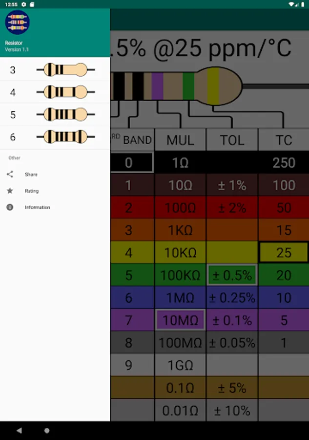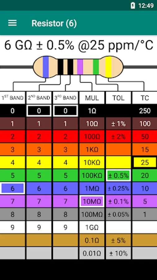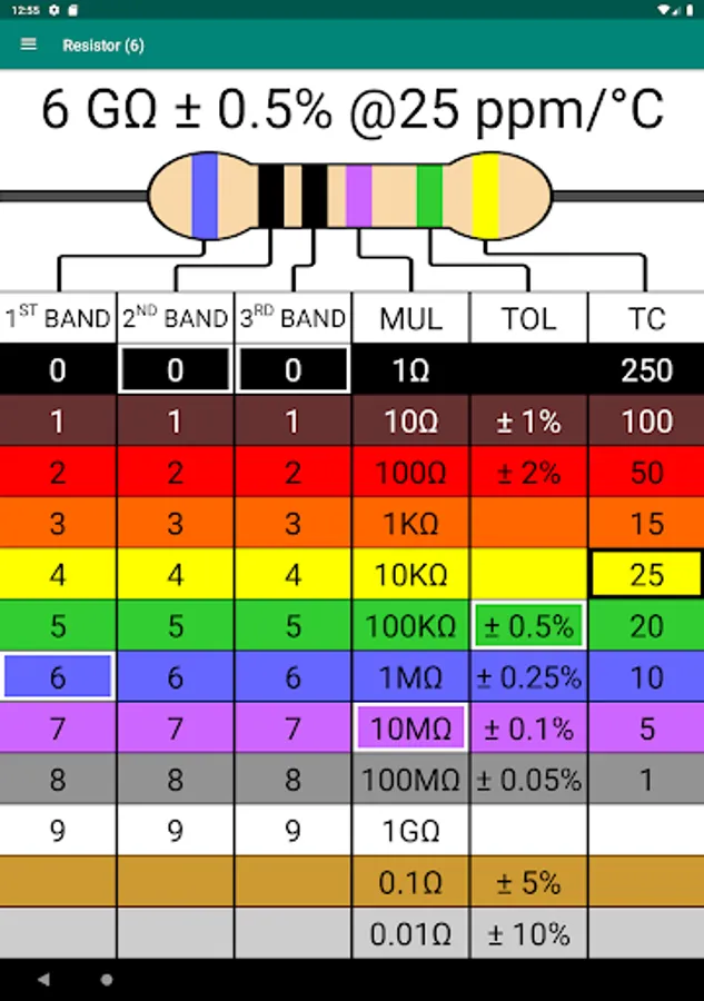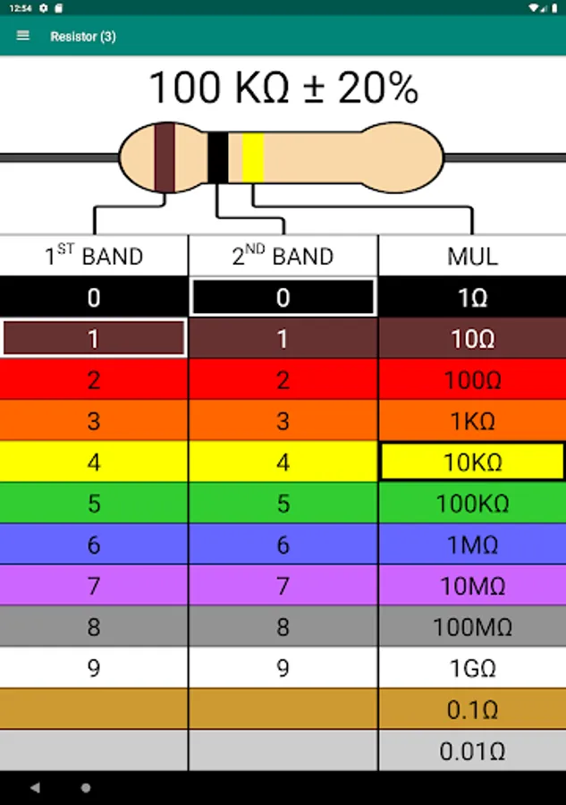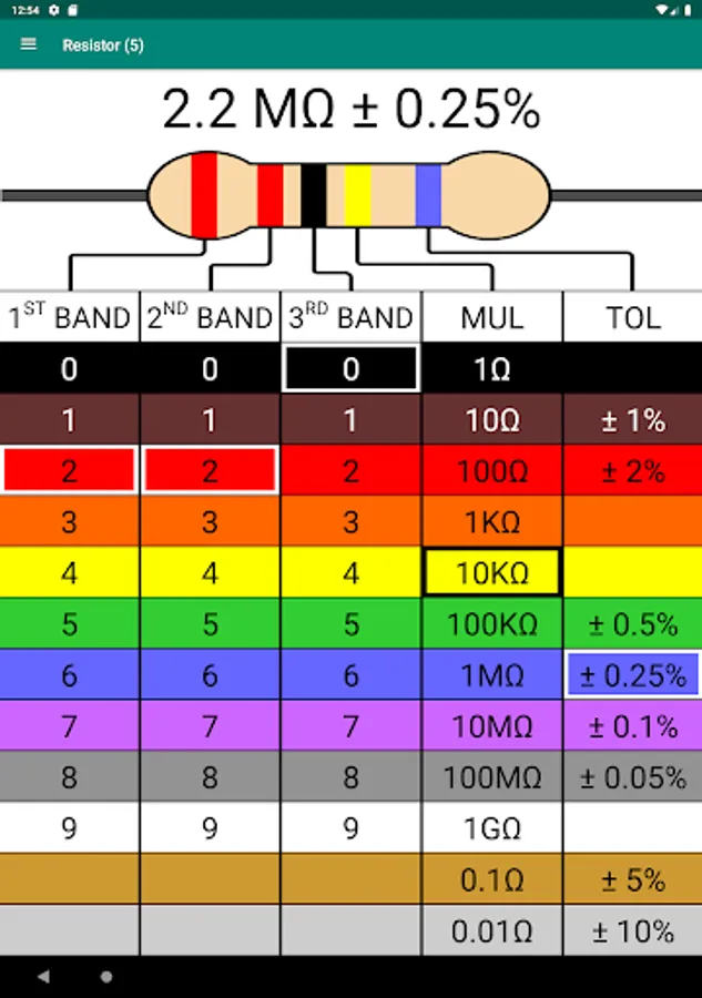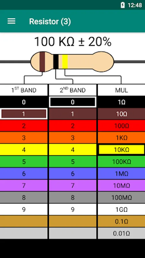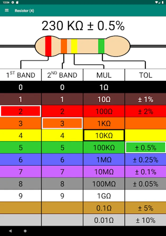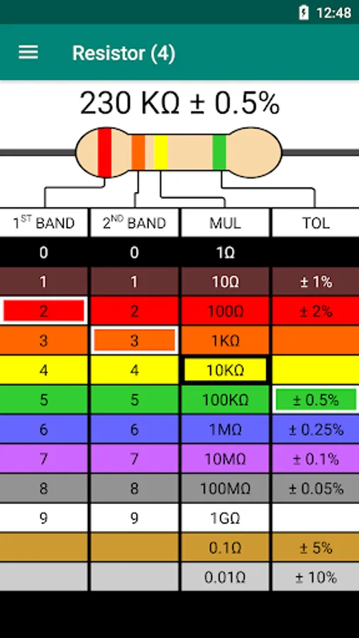 The application is an easy-to-use color code calculator for calculating the resistance of a resistor. The application supports color codes for 3, 4, 5, and 6-band resistors.