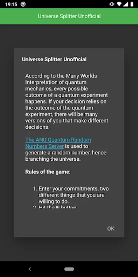 The ANU Quantum Random Numbers Server is used to generate a random number, hence branching the universe.