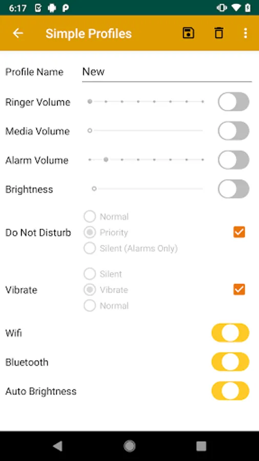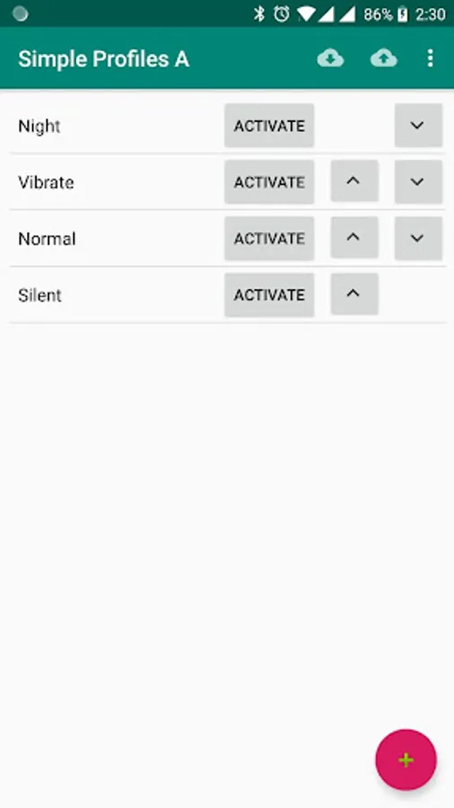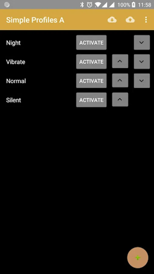 This app allows you to create and activate profiles for settings. It is lightweight and doesn't use much CPU and battery unlike other profiles app. (If you click activate, it will set the profiles. If you don't click anything it does not process anything in the background)