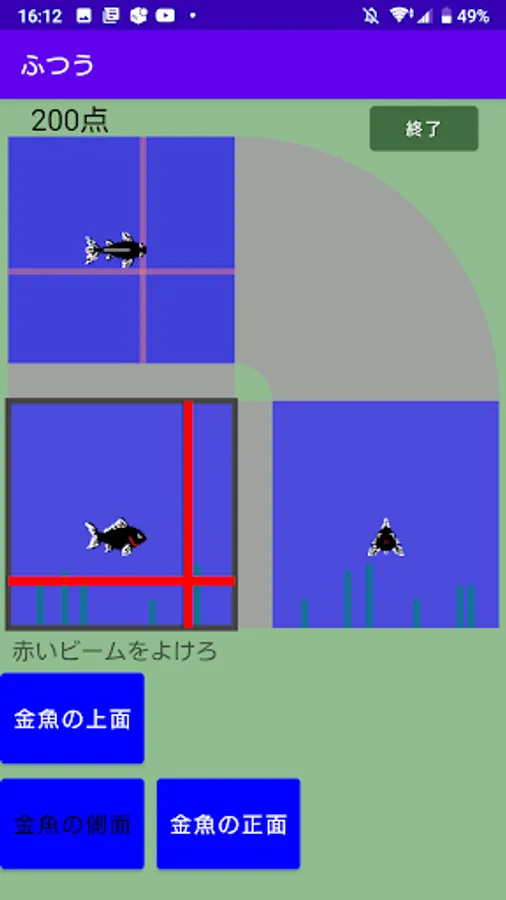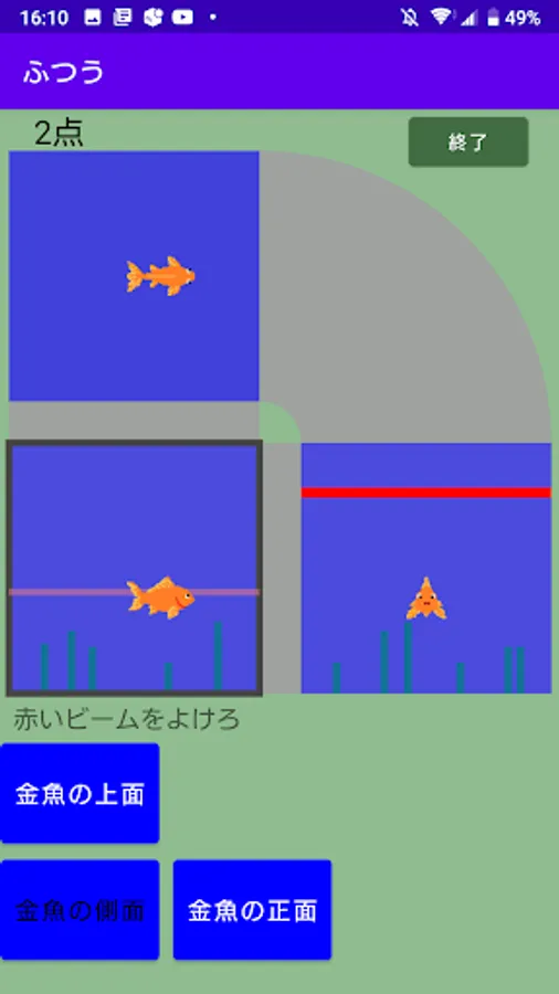 Since you are looking at one goldfish from three directions: front, side, and top, press the button and select the surface on which you want to operate the goldfish. Manipulate the goldfish to avoid the red beams emitted from the front, side, and top surfaces.