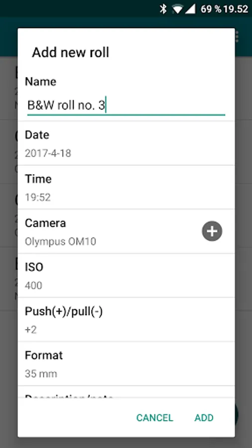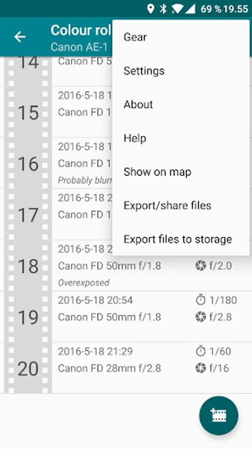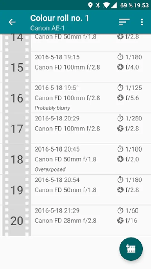 Exif Notes let's you quickly save important notes and exif data when shooting with film. It allows you to add frequently used gear such as camera bodies and lenses to your database. These can then be selected when adding new rolls of film and when adding new frames. When adding new frames you can save information such as time taken, lens used, shutter speed, aperture, location, custom notes and more.