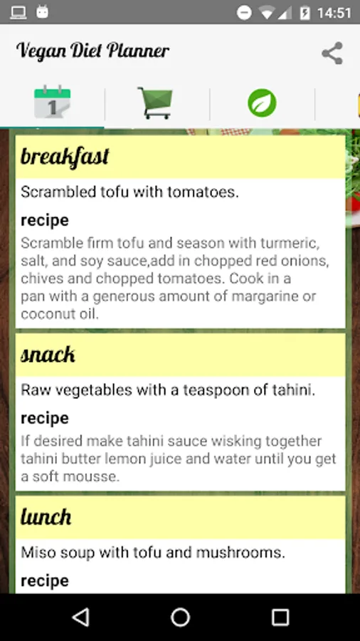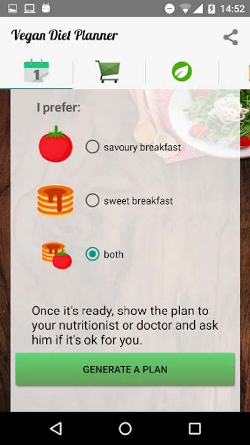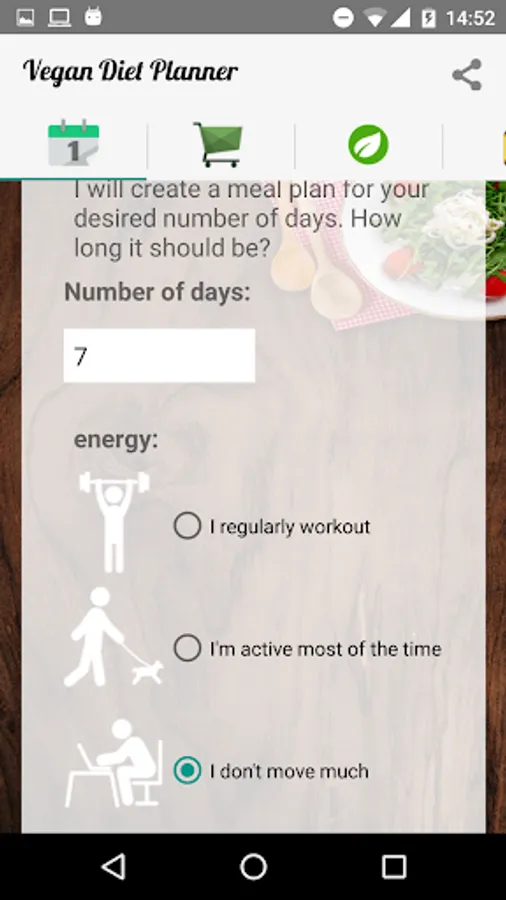 Vegan Diet Planner will create a meal plan you can follow for your desired number of days. Just decide how long it should be.