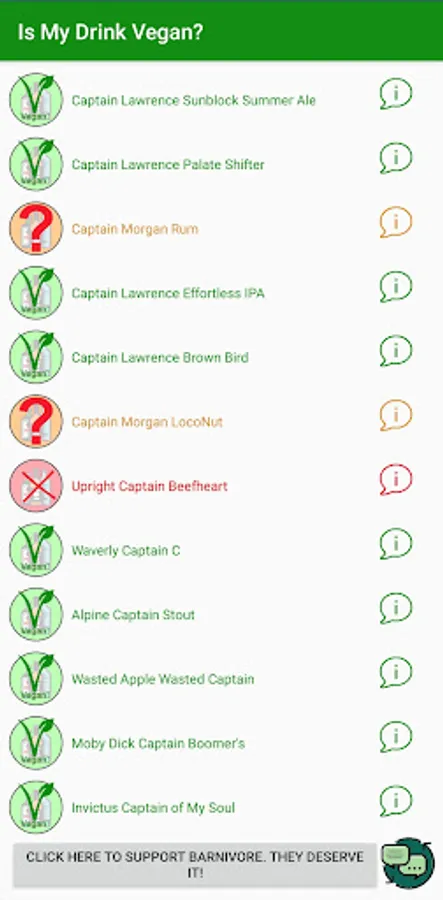 Simply enter the name of the drink in the app, and it will present all the information the good folks at barnivore collected with the help of the barnivore community.