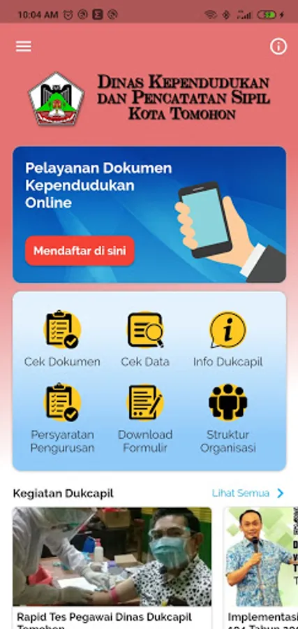 The Tomohon City Population and Civil Registration Service application in the form of a Mobile App, Hopefully it can be used by the Tomohon City community in dealing with the Tomohon City Population and Civil Registration Office