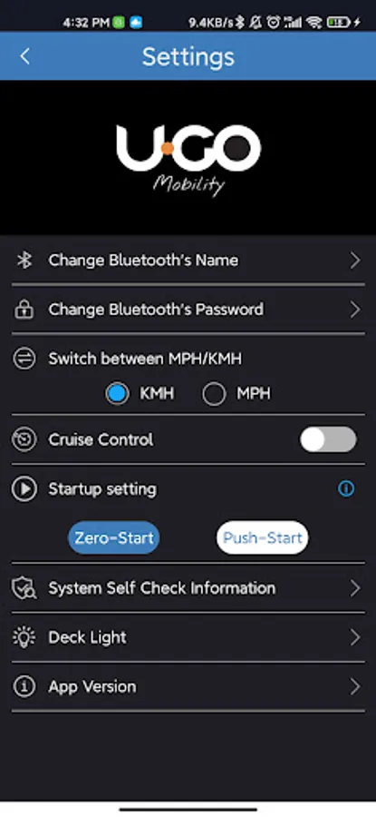 On the "Settings " page, modify the Bluetooth name,password and control deck light,check your vehicle,etc. through the APP on the settings page.