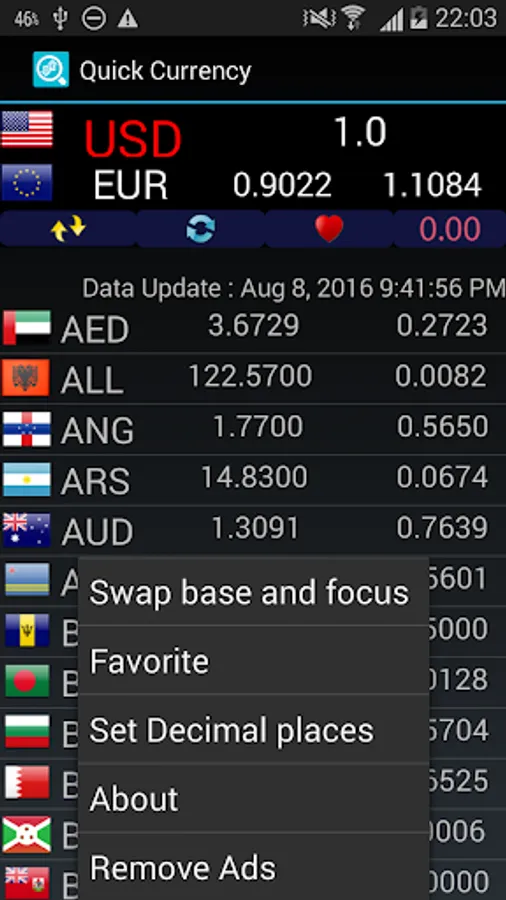 Over 100+ currencies are supported. Just choose base currency and set focus one, click update and see current rates all over the world.
