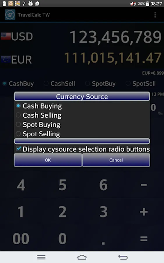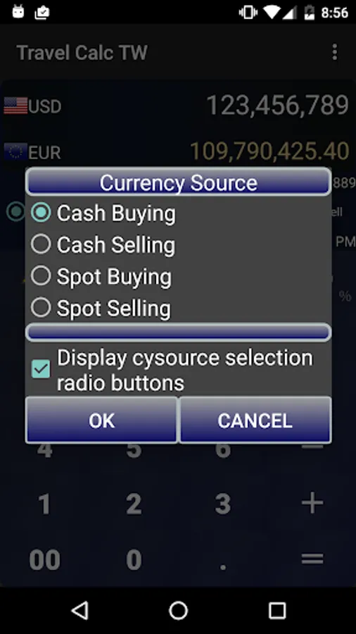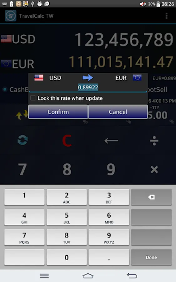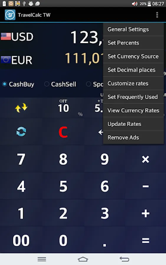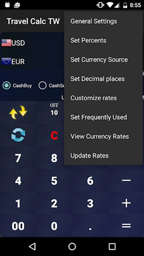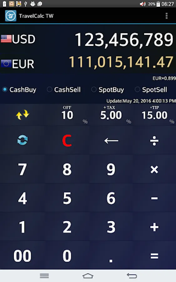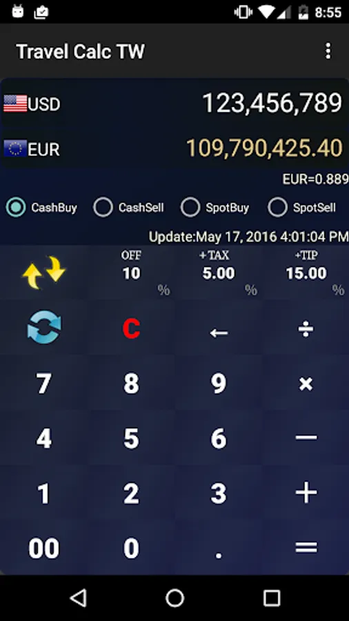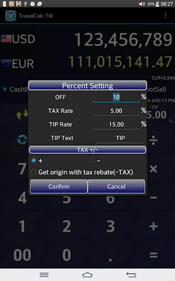 Exchange rates could be customized. Also OFF/TAX/TIP buttons are equipped.