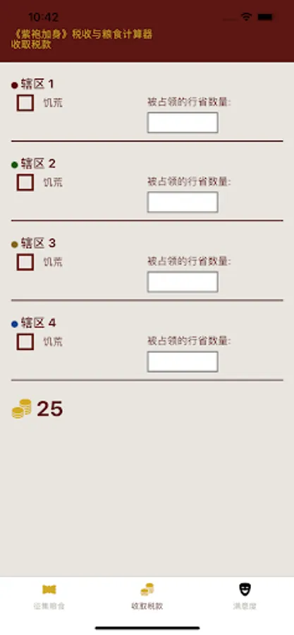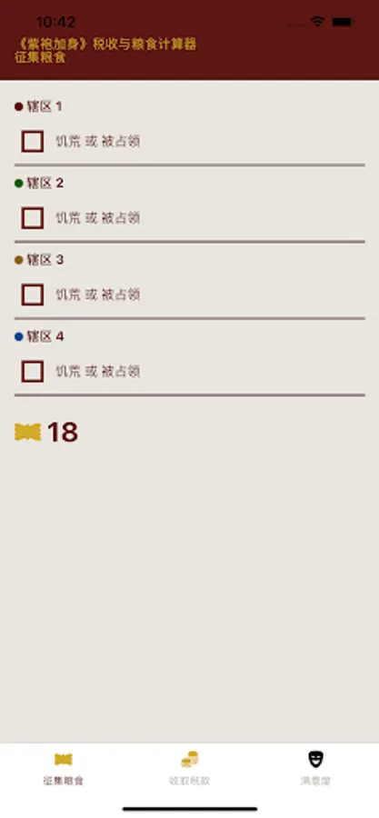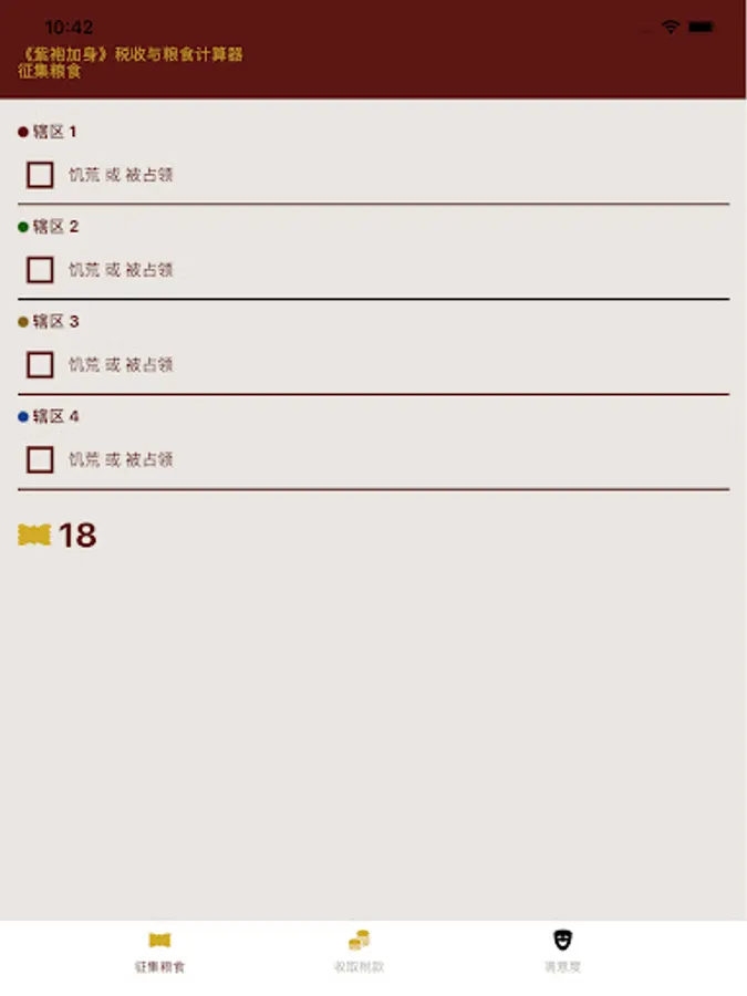 This application can help you quickly calculate the collection of food, tax collection and people's satisfaction, so as to get a smoother gaming experience. Just tick the boxes for Famine and Enemy Occupied Provinces and fill in the values.