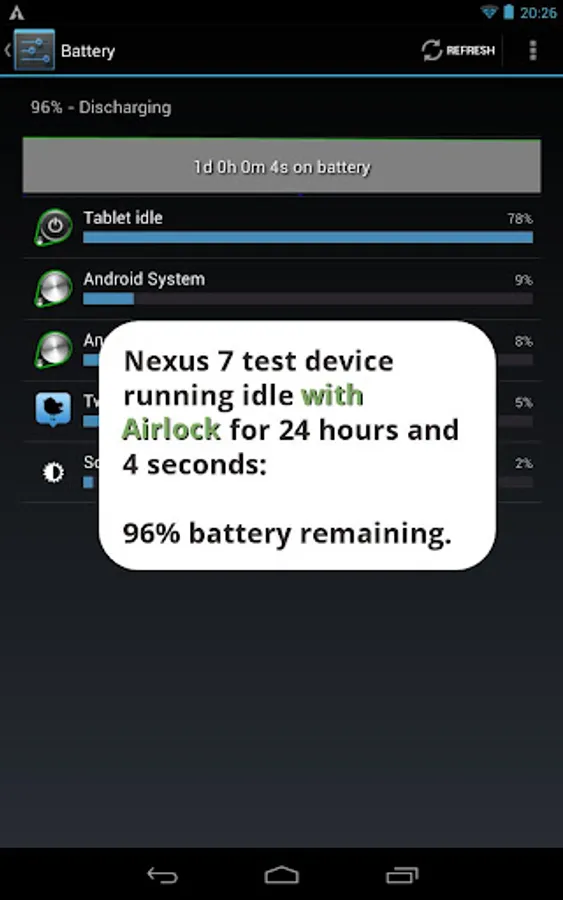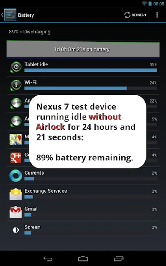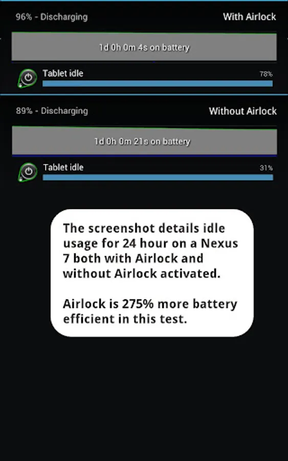 The battery life improvement varies depending on the Android device, but will make a considerable difference to the overall battery life. The screenshot details idle usage for 24 hour on a device both with Airlock and without Airlock activated. Airlock is 275% more battery efficient in this test.