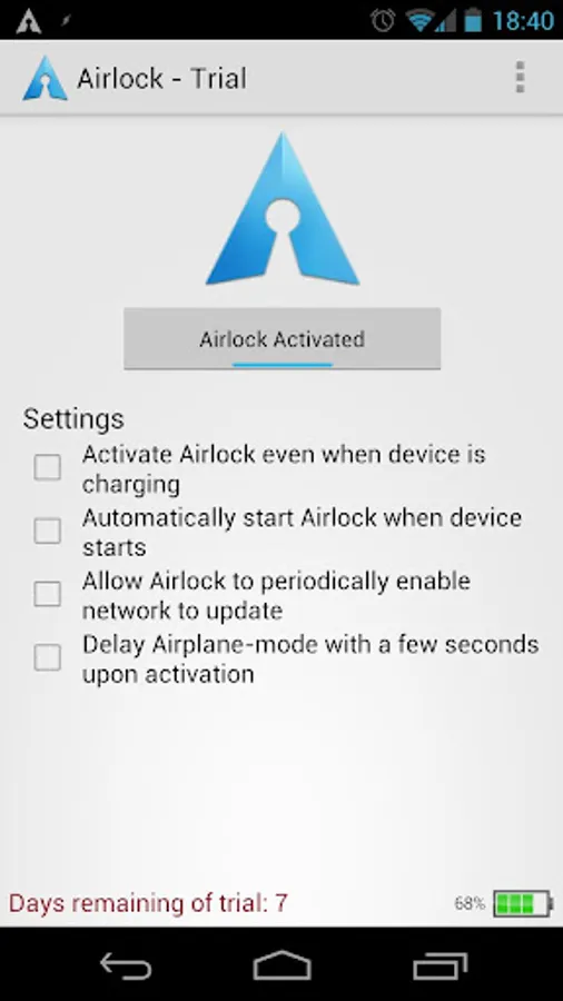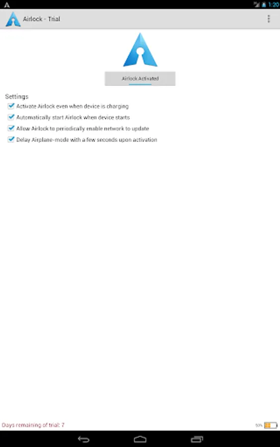 ▶ Please notice that this trial will end after seven (7) days. You can find the full version by searching for "Airlock - Battery saver" in Google Play.