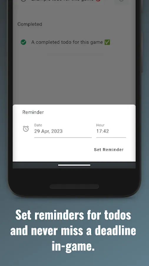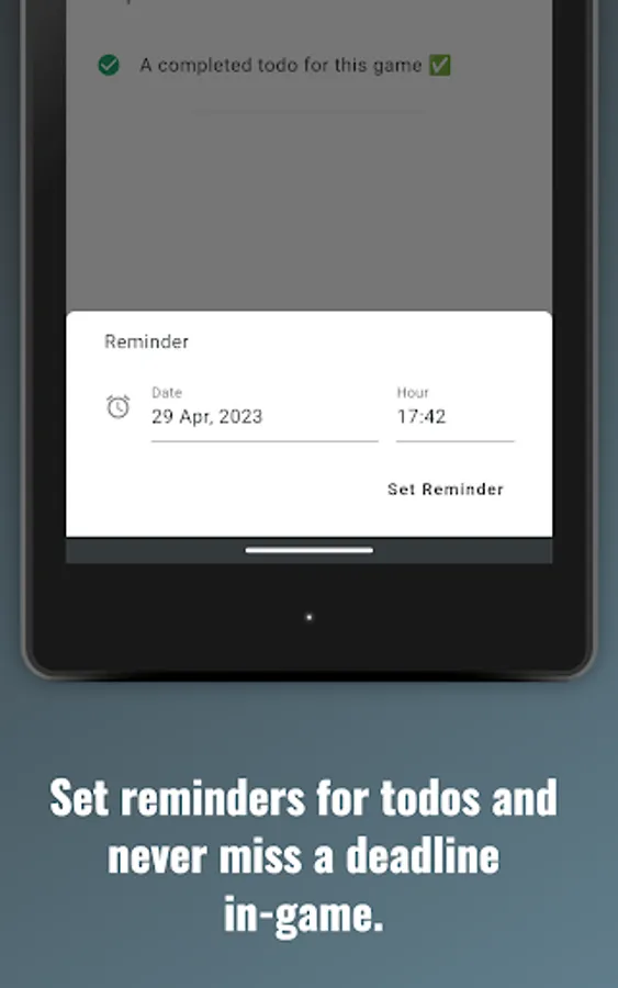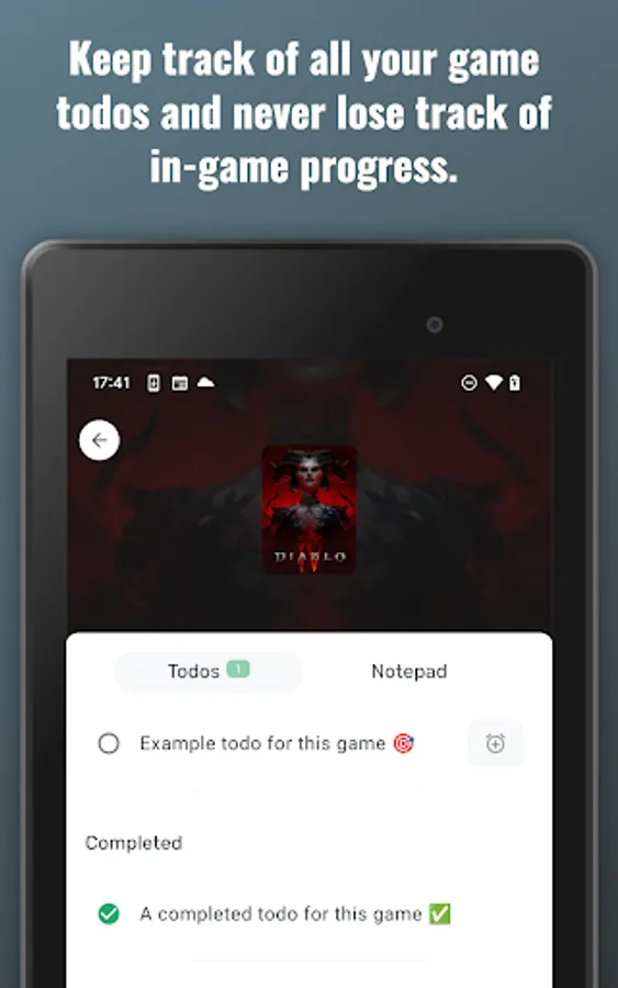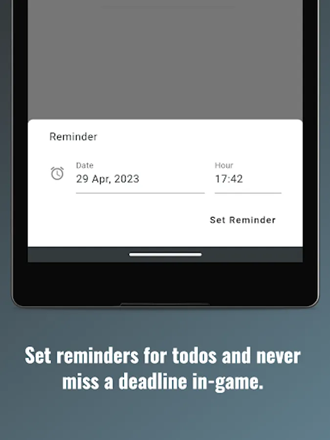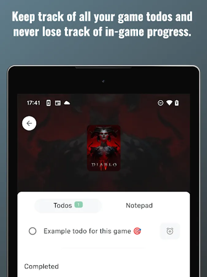 With our intuitive quest tracker, never miss out on any mission or side quest. Organize your game-related tasks efficiently with our game to-dos function, ensuring you always know your next move. Dive deeper into your gaming experience with our in-game reminders, ensuring you're always on top of your game.