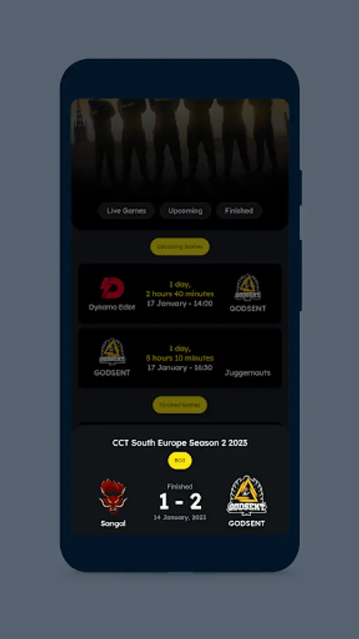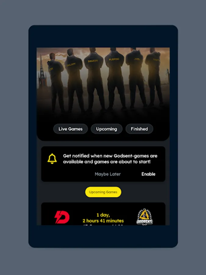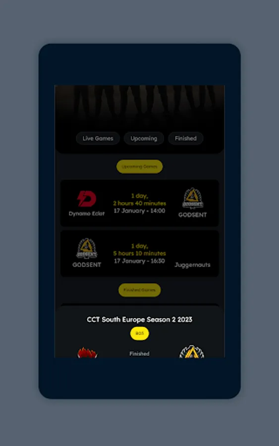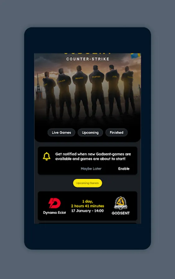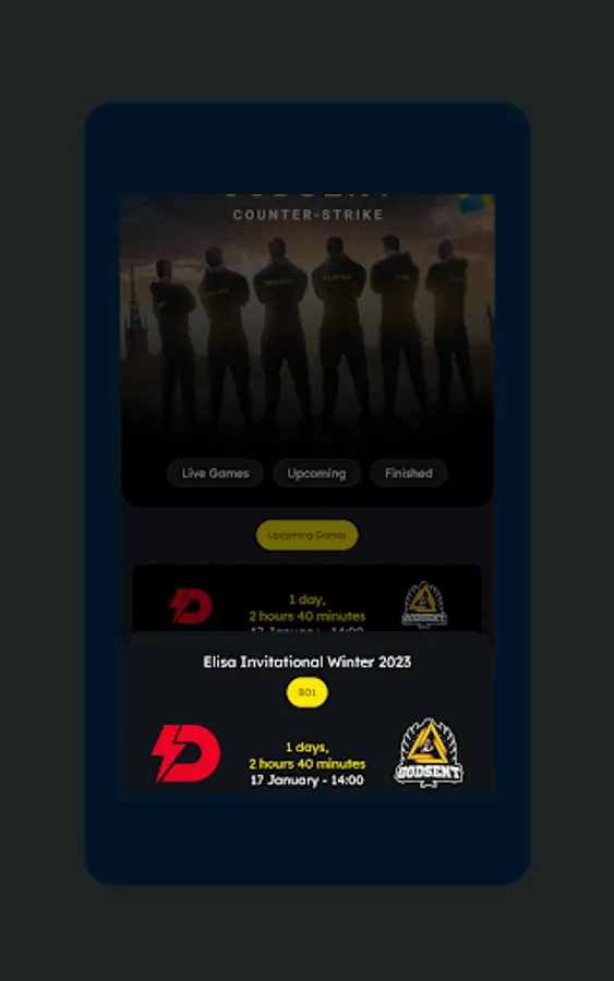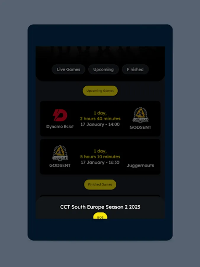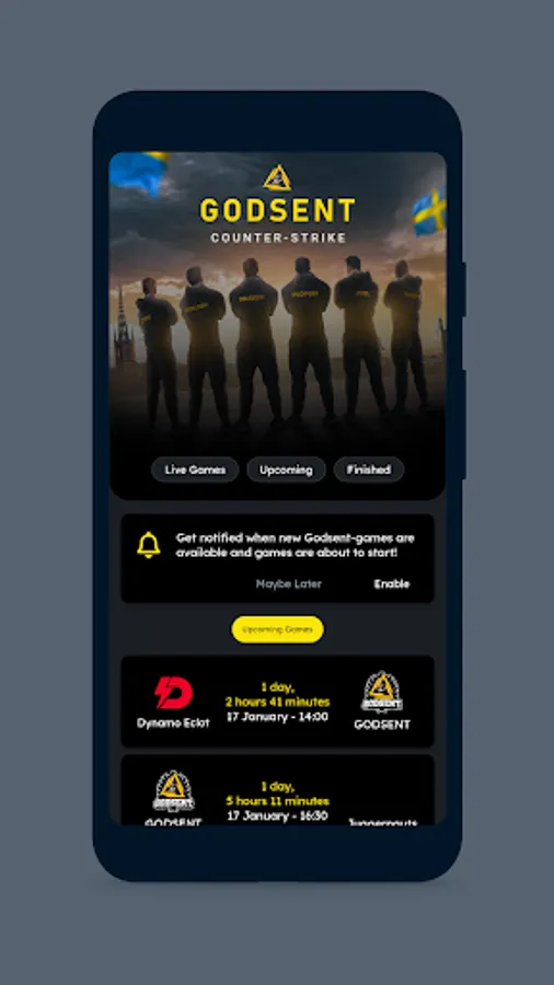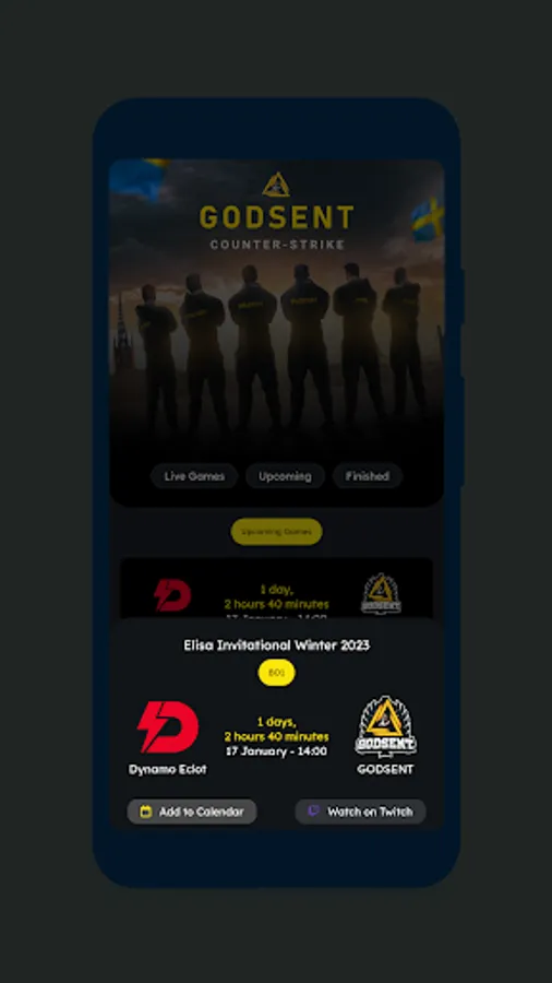 Keep up to date on upcoming and finshed CS:GO, LoL and Dota2 games for the Swedish esport power-house; Godsent.
