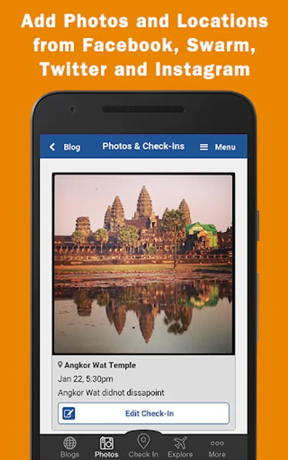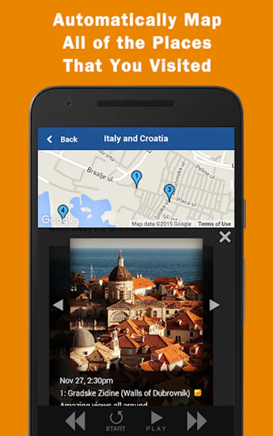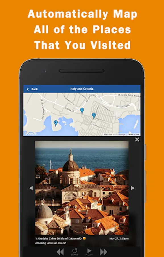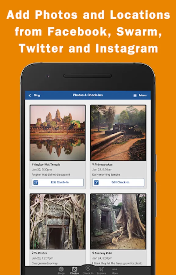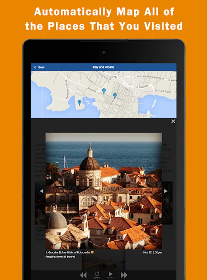 Upload multiple photos that you take offline and Jauntlet will automatically use the time and location of the photos to display them on your travel map and journal.