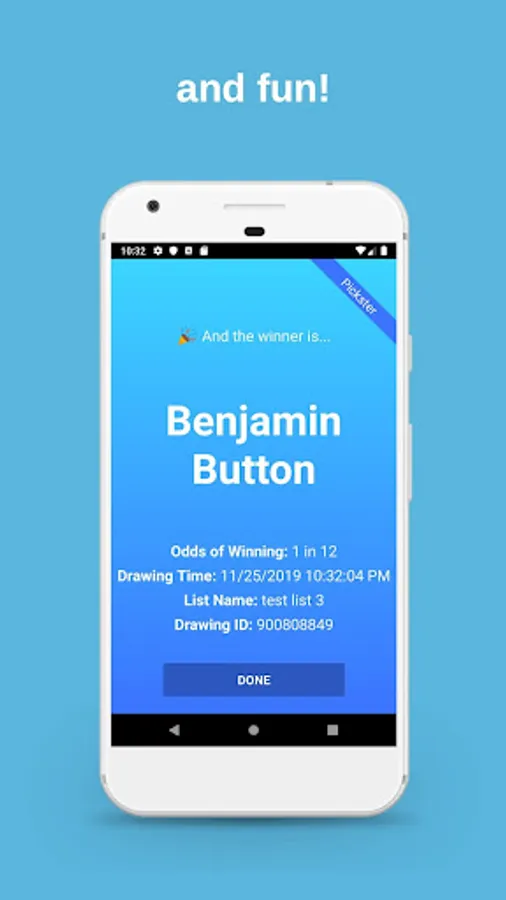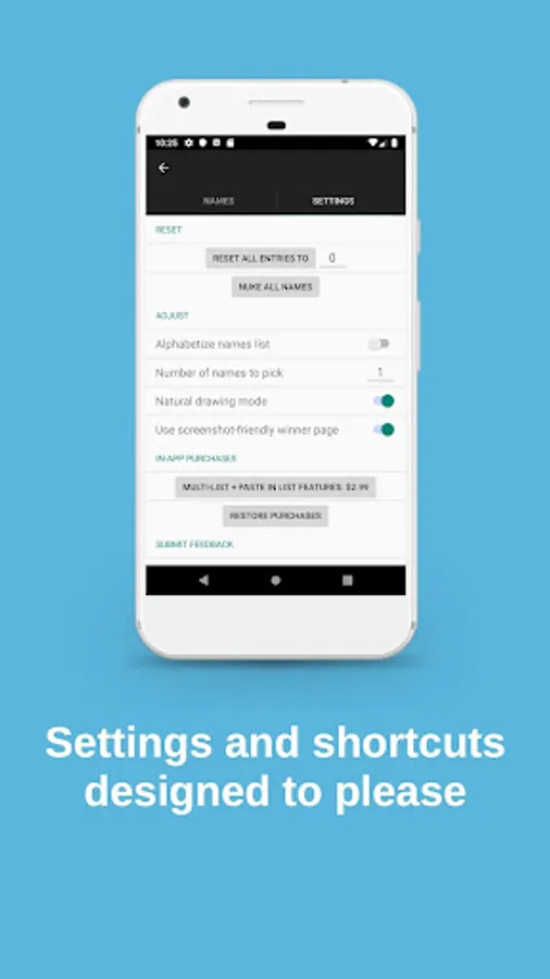 • New screen-shot friendly winner page! Now you can show everyone the result of the drawing with some fanfare, and without displaying everyone else's name in the list. Switch it on per list in the Settings page when drawing one name at a time.